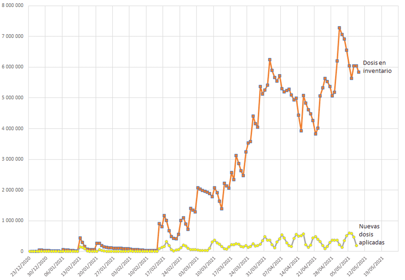 Durante el mes de marzo los volúmenes de entregas de vacunas excedieron en cantidades cada vez mayores los volúmenes semanales de aplicación de las mismas, como se muestra en la gráfica siguiente. Esta gráfica compara las cantidades diarias de dosis aplicadas con las cantidades de dosis disponibles al inicio del día. Por ejemplo, al iniciar el 18 de febrero se contaba con 1 millón de dosis en inventario, y al terminar el día se habían aplicado 327 305 de ellas (33 %). Siete semanas después, el 7 de abril, el día inició con 5.38 millones de dosis en inventario, de las que se aplicaron 533 760 (10 %) en el curso de la jornada. El inventario de vacunas no aplicadas fluctuó entre 4 y 6 millones de dosis durante el mes de abril, cerrando en 5.84 millones de dosis al corte del 8 de mayo. Ese día se aplicaron 198 480 (3.3 %) de las 6.04 millones de dosis disponibles al inicio de la jornada.