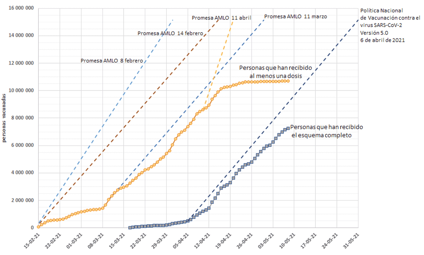 El 30 de abril el presidente anunció que 50 millones de mexicanos estarían vacunados a mediados de año (“a finales de junio, principios de julio”).