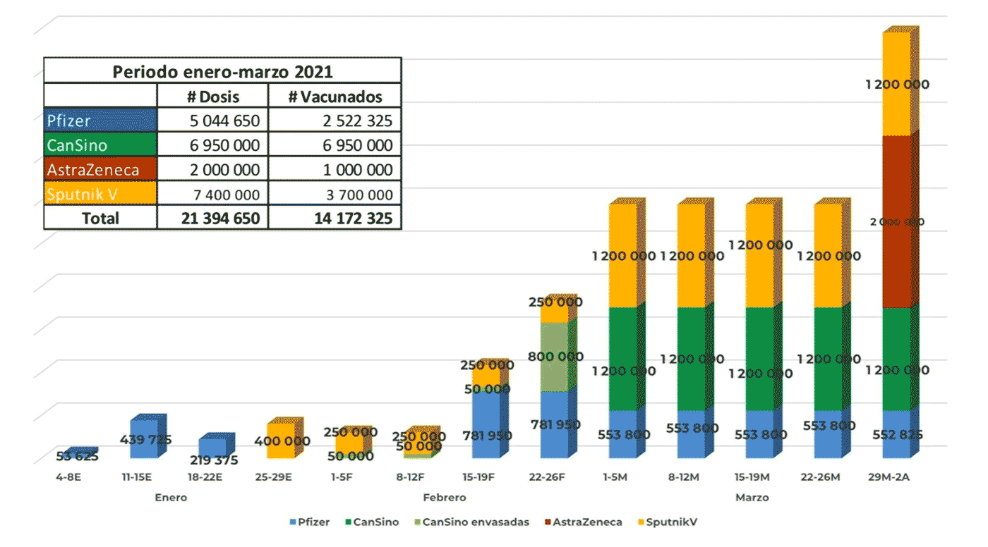 La primera de ellas es la línea roja entrecortada, que corresponde al plan presentado en la conferencia mañanera del 19 de enero por el canciller Marcelo Ebrard. Al arranque de la vacunación en diciembre sólo se contaba con entregas semanales de la vacuna Pfizer-BioNTech, de la que se esperaba recibir alrededor de 460 000 dosis cada semana. El plan presentado el 19 de enero tomaba en cuenta la interrupción temporal del suministro de vacunas Pfizer durante tres semanas a fines de enero y principios de febrero, y consideraba aplicar 7.4 millones de dosis de la vacuna Sputnik V y 6.95 millones de dosis de la vacuna CanSino antes del 2 de abril. Cuando se hizo este anuncio ninguna de estas dos vacunas contaba con autorización de emergencia de la Cofepris para su uso en México. El plan también consideraba recibir 2 millones de dosis de la vacuna AstraZeneca envasada en México en la última semana de marzo.