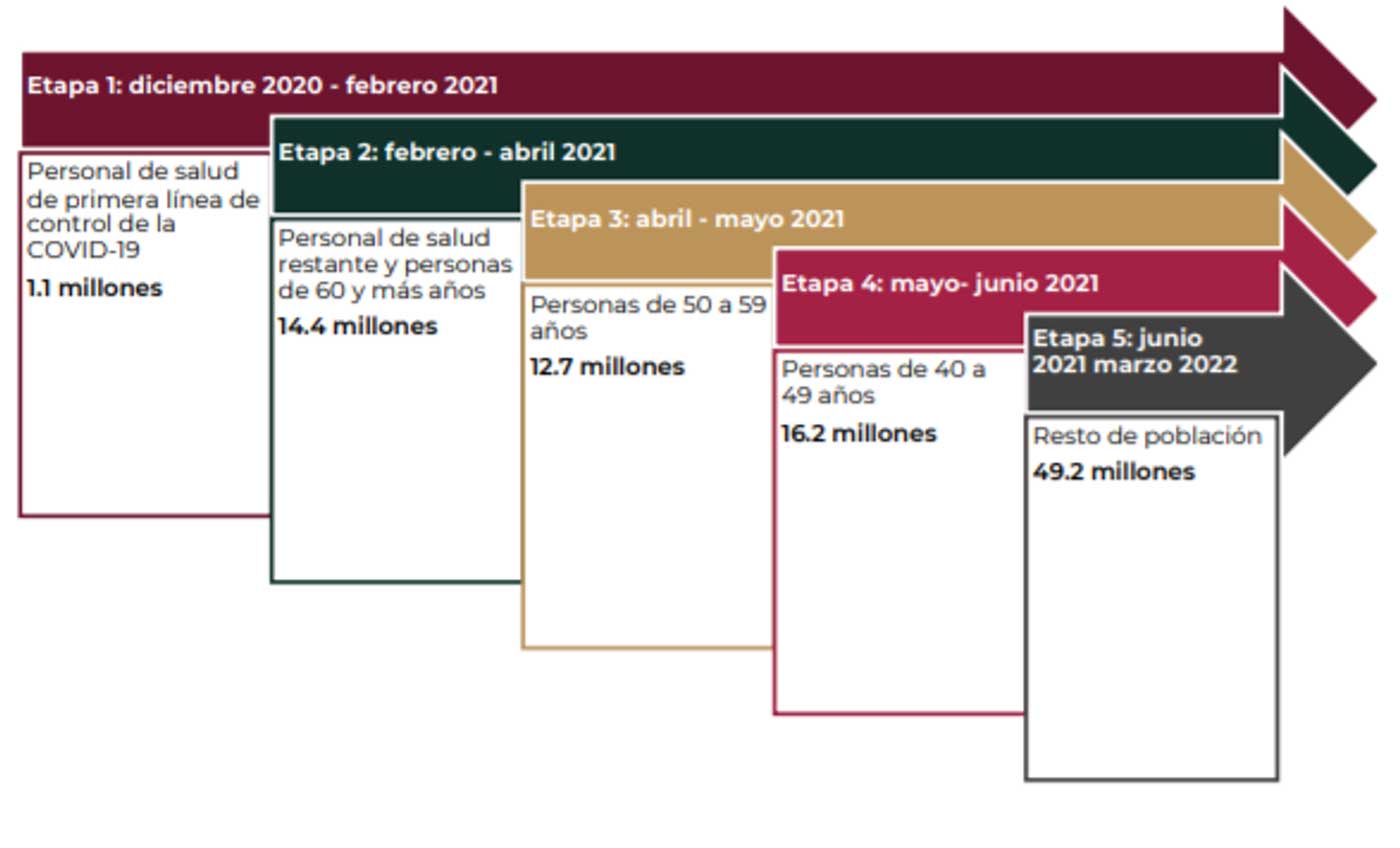 La Secretaría de Salud publicó el 11 de enero el documento rector de la política nacional de vacunación contra el virus SARS-CoV-2. Este documento definió 5 etapas de la estrategia de vacunación por grupos poblacionales: