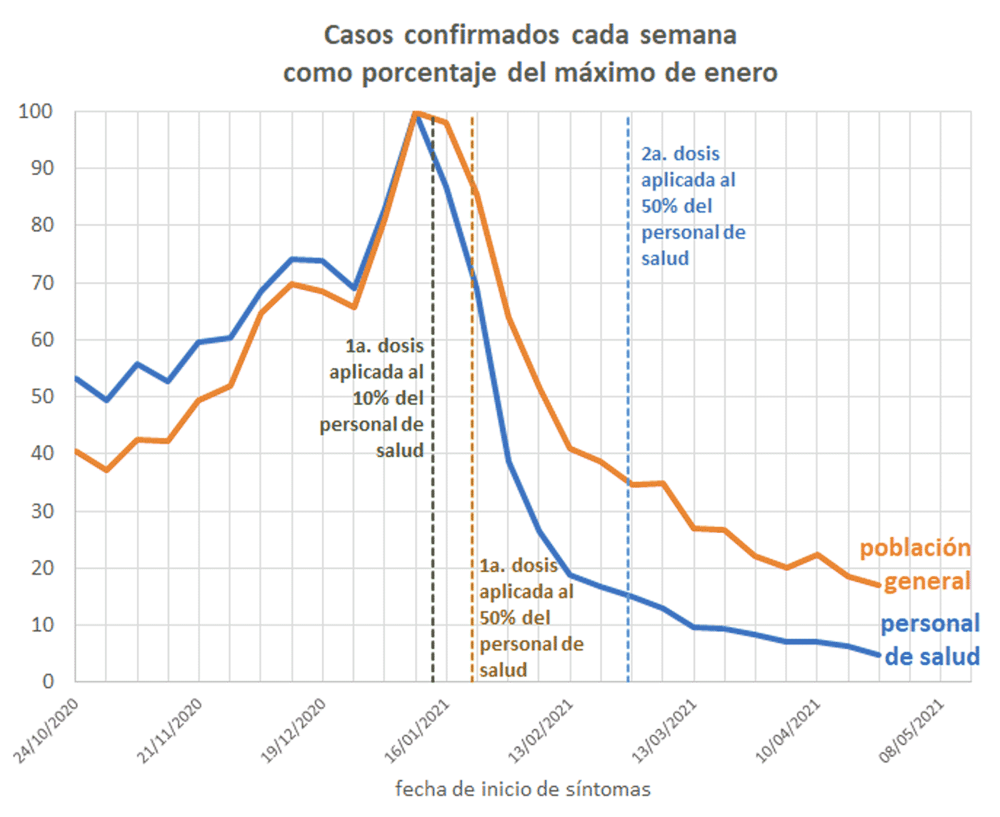 Los casos confirmados entre el personal de salud han disminuido más rápidamente que entre la población en general a partir de mediados de enero, cuando se alcanzó la cobertura del 50 % del personal de salud con al menos una dosis, como se muestra en la siguiente gráfica.