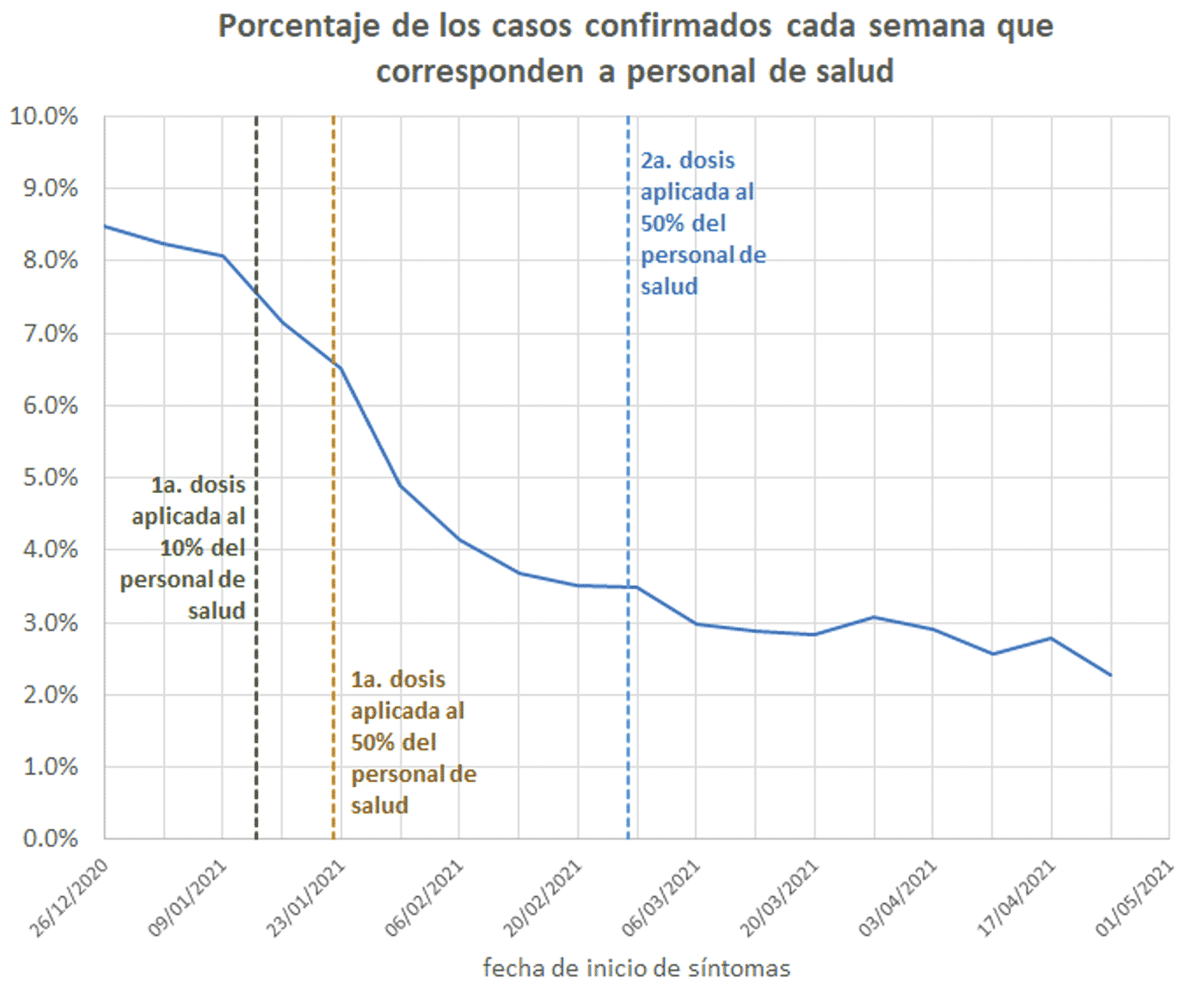 Antes de iniciar la campaña de vacunación, el personal de salud representaba alrededor del 9 % de los casos de covid-19 detectados en México. La razón se debe a que los lineamientos de la Secretaría de Salud dictan que se tome muestra a todo trabajador del sector de salud con síntomas de covid-19, mientras que al resto de la población se le aplica el criterio centinela y sólo se le toma muestra a uno de cada 10 casos con síntomas que no requieran hospitalización. Entre personas con covid-19 confirmado que iniciaron síntomas en la semana que terminó el 23 de abril, la proporción correspondiente a personal de salud fue sólo el 2.3 %.