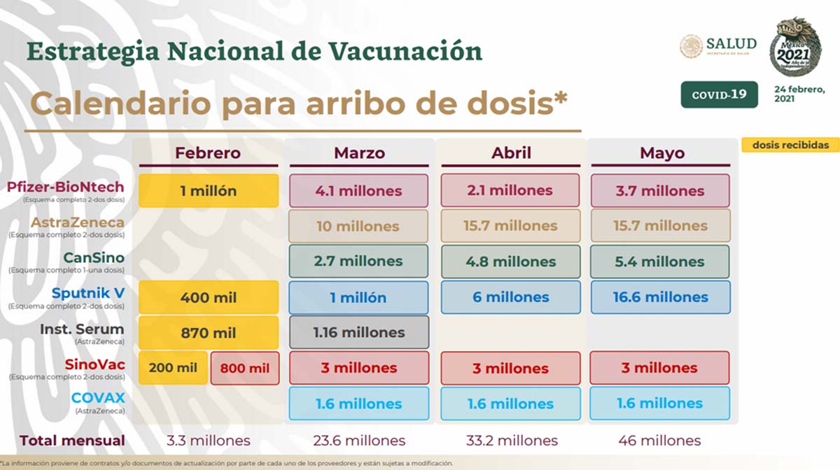 1 Se han recibido más de 9 millones de dosis adicionales de AstraZeneca fuera del contrato con esa empresa: 870 000 dosis adquiridas al Serum Institute de la India, 5 532 000 de dosis compradas a través del mecanismo COVAX y 2.7 millones de dosis “en préstamo” de parte del gobierno de Estados Unidos.