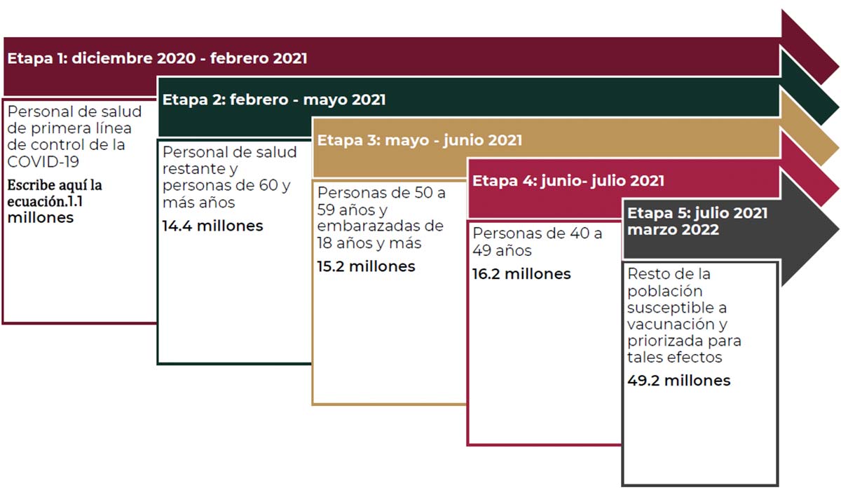La Secretaría de Salud publicó el 28 de septiembre su actualización más reciente al documento rector de la política nacional de vacunación contra el virus SARS-CoV-2. Este documento define 5 etapas de la estrategia de vacunación por grupos poblacionales: