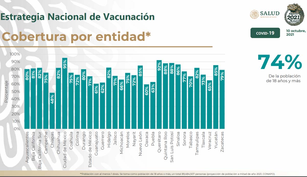 Como la Secretaría de Salud ya no informa el número de personas vacunadas desglosado por grupo objetivo, no es posible cuantificar el avance de cada etapa. Ahora publican cada día una gráfica con el porcentaje de la población adulta de cada entidad que ha recibido al menos una dosis. En Baja California, donde el presidente declaró concluida la vacunación, la cobertura alcanzada es sólo del 81 % mientras que en la Ciudad de México reportan una cobertura del 95 %. En el otro extremo está Chiapas, estado en el que sólo el 48 % de la población adulta ha recibido vacunas. Llama la atención el contraste en acceso a la vacunación entre la Ciudad de México y el vecino Estado de México, en el que sólo el 71 % de los adultos han recibido al menos una dosis.