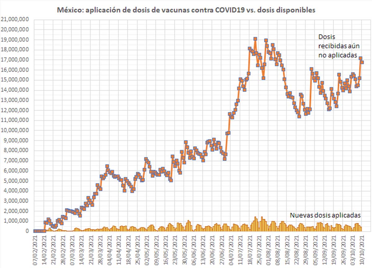 Desde el mes de marzo hasta fines de julio, los volúmenes de entregas de vacunas excedieron en cantidades cada vez mayores los volúmenes semanales de aplicación de las mismas, como se muestra en la gráfica siguiente. Ésta compara las cantidades diarias de dosis aplicadas con las cantidades de dosis disponibles al inicio del día. Por ejemplo, al iniciar el 18 de febrero se contaba con 1 millón de dosis en inventario, y al terminar el día se aplicaron 326 136 de ellas (33 %), mientras que al iniciar el 8 de octubre se contaba con 15.2 millones de dosis recibidas aún sin aplicar y a al terminar del día de aplicaron 608 818 (4 %). El inventario de vacunas no aplicadas ha excedido 12 millones de dosis desde principios de julio, alcanzando un máximo de 20.5 millones de dosis el 22 de ese mes. En las últimas cuatro semanas el inventario de vacunas pendientes de aplicar ha fluctuado entre 12.4 y 17.2 millones de dosis.