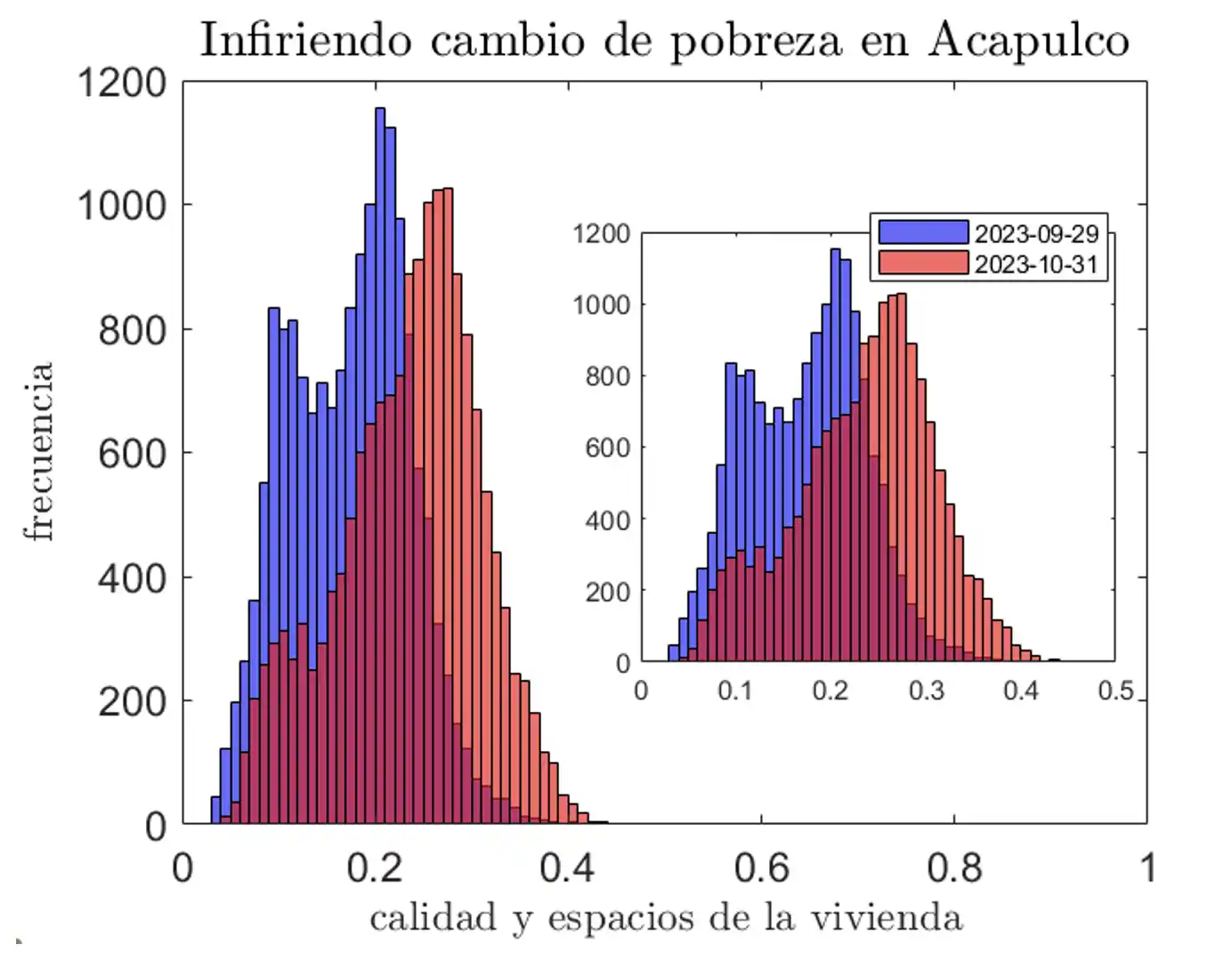 La tragedia de Otis resalta la relación entre desastres naturales y pobreza. Datos del Consejo Nacional de Evaluación de la Política de Desarrollo Social (Coneval), la agencia encomendada por ley para definir, identificar y medir la pobreza en México, indican que durante 2020, en Guerrero, 2 363 188 personas vivían en situación de pobreza, lo que representa el 64 % de la población estatal. El 25.9 % de la población tenía carencia por calidad y espacios de la vivienda y el 56.3 % por carencia de servicios básicos. De acuerdo con las cifras de Coneval, tan sólo en Acapulco se registraban 394 861 personas en situación de pobreza y 125 672 personas en situación de pobreza extrema. Sería relevante determinar el efecto del paso del huracán Otis en los niveles de pobreza en Acapulco. Sin embargo, las evaluaciones realizadas por Coneval, las cuales están basadas en la realización de encuestas sobre muestras de población, se llevan a cabo cada dos años a nivel estatal y cada cinco años a nivel municipal. Este artículo hace un análisis complementario basado en el uso de información satelital, datos censales, indicadores de Coneval y algoritmos de aprendizaje automático para buscar reflejar el cambio en la situación de pobreza de las zonas afectadas por el paso del huracán.