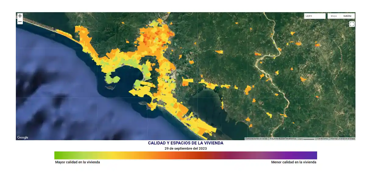 Para realizar la evaluación de la pobreza en Acapulco antes y después del huracán, se emplearon imágenes del satélite Landsat 9 suministradas por el Servicio Geológico de Estados Unidos (USGS). Para estimar el índice de pobreza se analizaron 16 484 imágenes satelitales de 600 por 600 metros tomadas el 29 de septiembre de 2023, abarcando las manzanas residenciales ubicadas en Acapulco. Luego, para medir el impacto del huracán en estas mismas áreas, se procesó el mismo número de imágenes, pero ahora tomadas el 31 de octubre de 2023. Este método proporcionó una comparación entre las condiciones antes y después del evento.