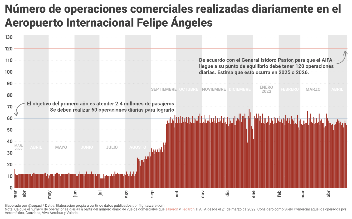 ¿Qué muestran los datos oficiales? De acuerdo con las cifras de la AFAC, entre el 21 de marzo de 2022 y el 31 de marzo de 2023 el AIFA atendió a 1 419 535 pasajeros, cifra que representa 59.1 % de la meta oficial de 2.4 millones. En el caso de las operaciones comerciales, el nuevo aeropuerto vio despegar o aterrizar 13 865 vuelos de este tipo, mismos que representan el 63.3 % de los 21 900 proyectados. De forma consistente con esta divergencia entre los objetivos iniciales y los resultados obtenidos, el AIFA recibió aproximadamente 1628 millones de pesos de subsidio para operar durante su primer año, monto 80.7 % mayor al originalmente contemplado.