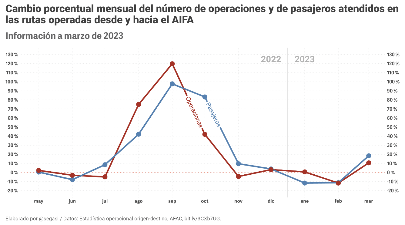 11 Por ejemplo, de las 2655 operaciones adicionales registradas en el SAM en marzo de 2023 respecto al mismo mes del año anterior, 1624 ocurrieron en el AIFA.
