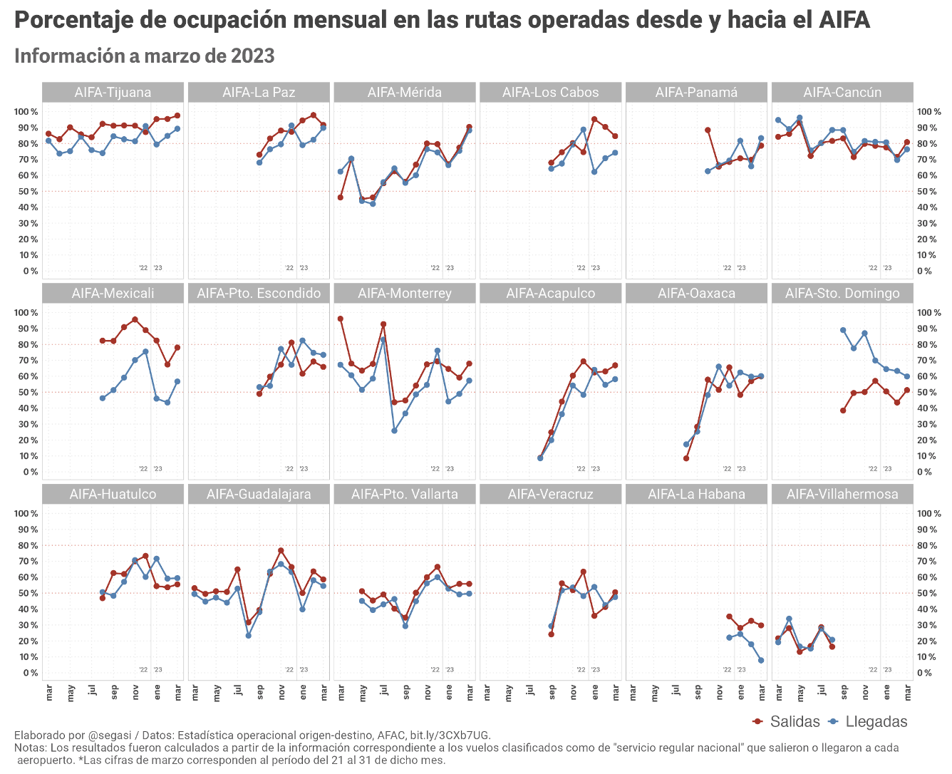Segundo, en marzo tres rutas tuvieron un porcentaje de ocupación superior al 80 % en los vuelos de ambas direcciones (AIFA-Tijuana, AIFA-La Paz y AIFA-Mérida). Para las rutas AIFA-Los Cabos, AIFA-Panamá y AIFA-Cancún, el porcentaje de ocupación de los vuelos en un sentido fue mayor a 80 %, pero menor a este nivel en el sentido contrario. Para 10 rutas más el porcentaje de ocupación se ubicó aproximadamente en el rango que va de 50 a 80 %; y la ruta AIFA-La Habana es la única activa que —por cuarto mes consecutivo— tuvo 50 % o menos de ocupación en ambas direcciones.
