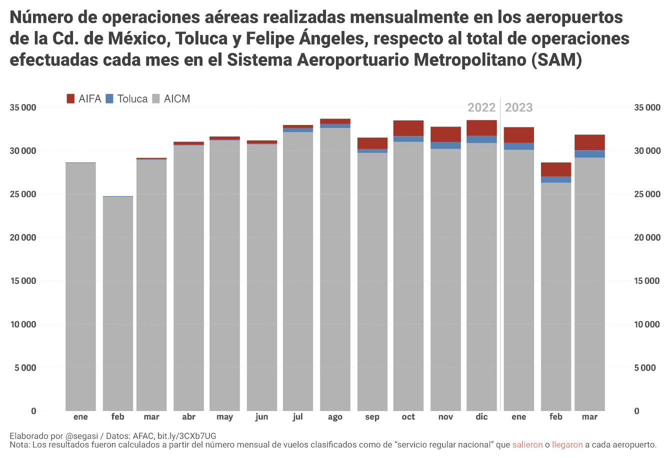 Los resultados calculados a partir de la información oficial también indican que en marzo de 2023 se realizaron 31 831 operaciones comerciales en los tres aeropuertos (AICM, AIFA y Toluca) que integran el Sistema Aeroportuario Metropolitano (SAM)—la sexta mejor cifra desde marzo de 2022—, en las que se atendieron casi 4.4 millones de pasajeros.