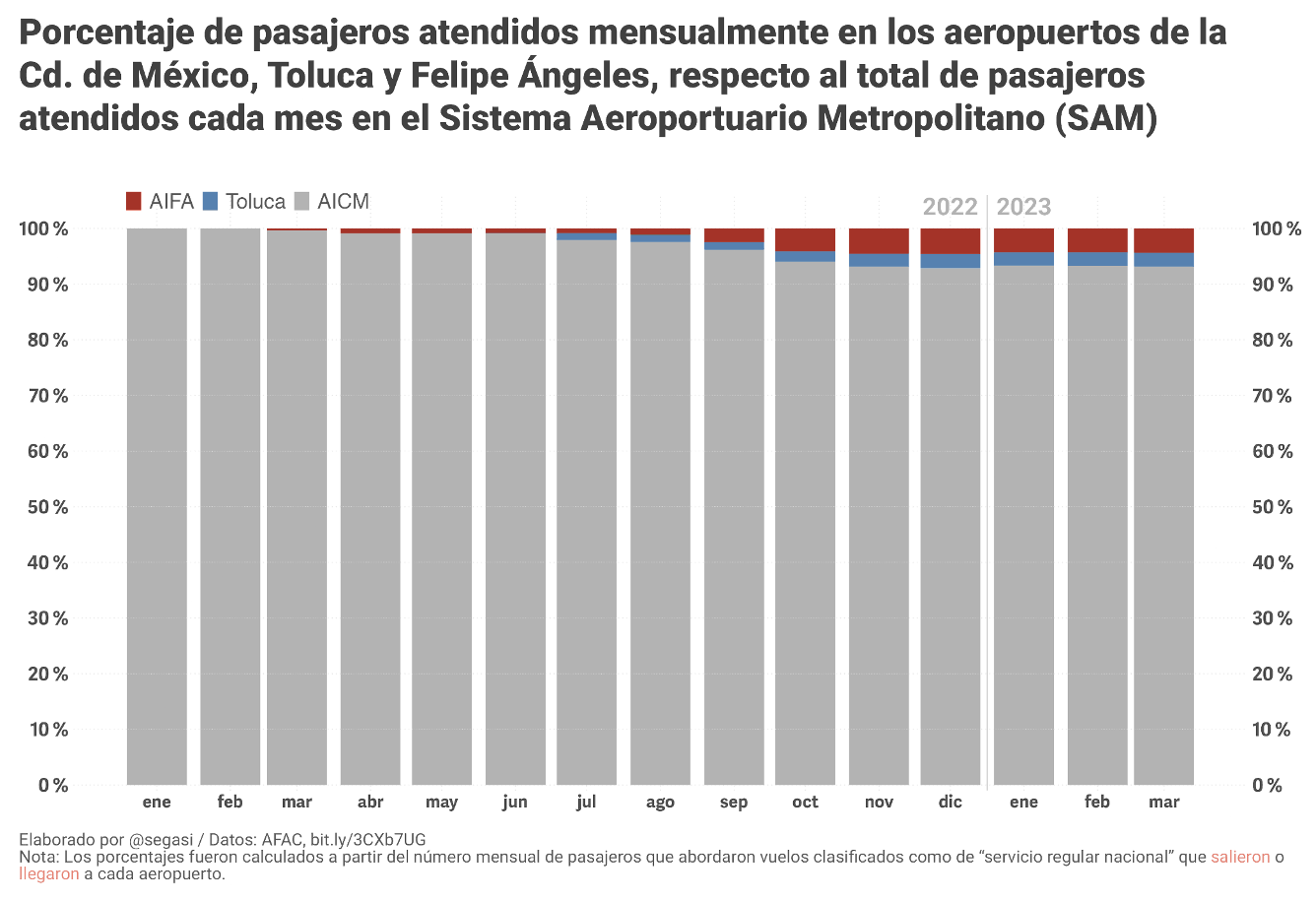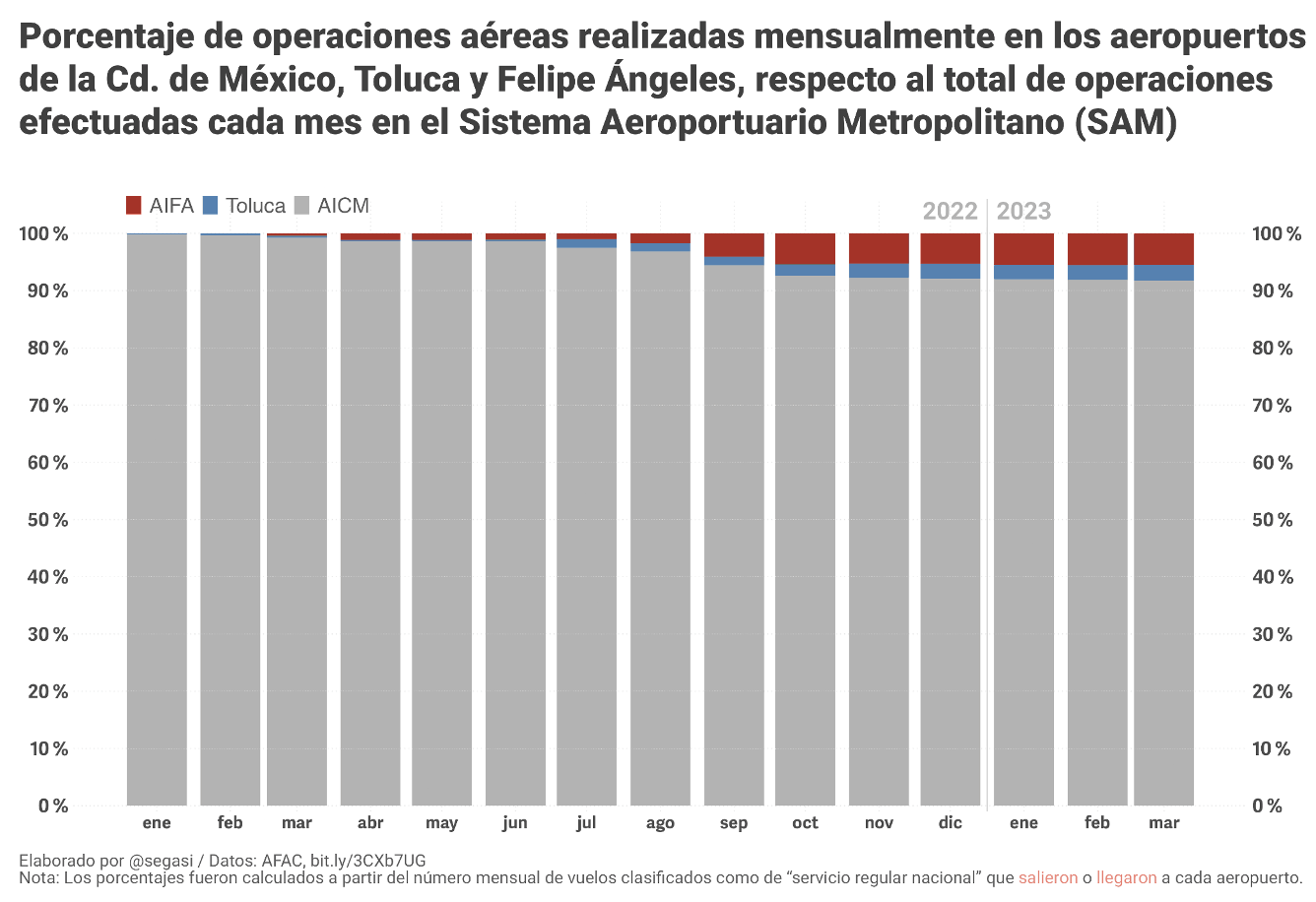 La gráfica de arriba muestra que si bien la participación del AIFA y Toluca en el total de las operaciones comerciales del SAM creció progresivamente entre marzo y diciembre del año pasado, en los primeros tres meses del 2023 parece haberse estabilizado. Entre enero y marzo de este año aproximadamente el 92 % de las operaciones comerciales se han realizado en el AICM, cerca del 5.5 % en el AIFA y 2.5 % en Toluca.