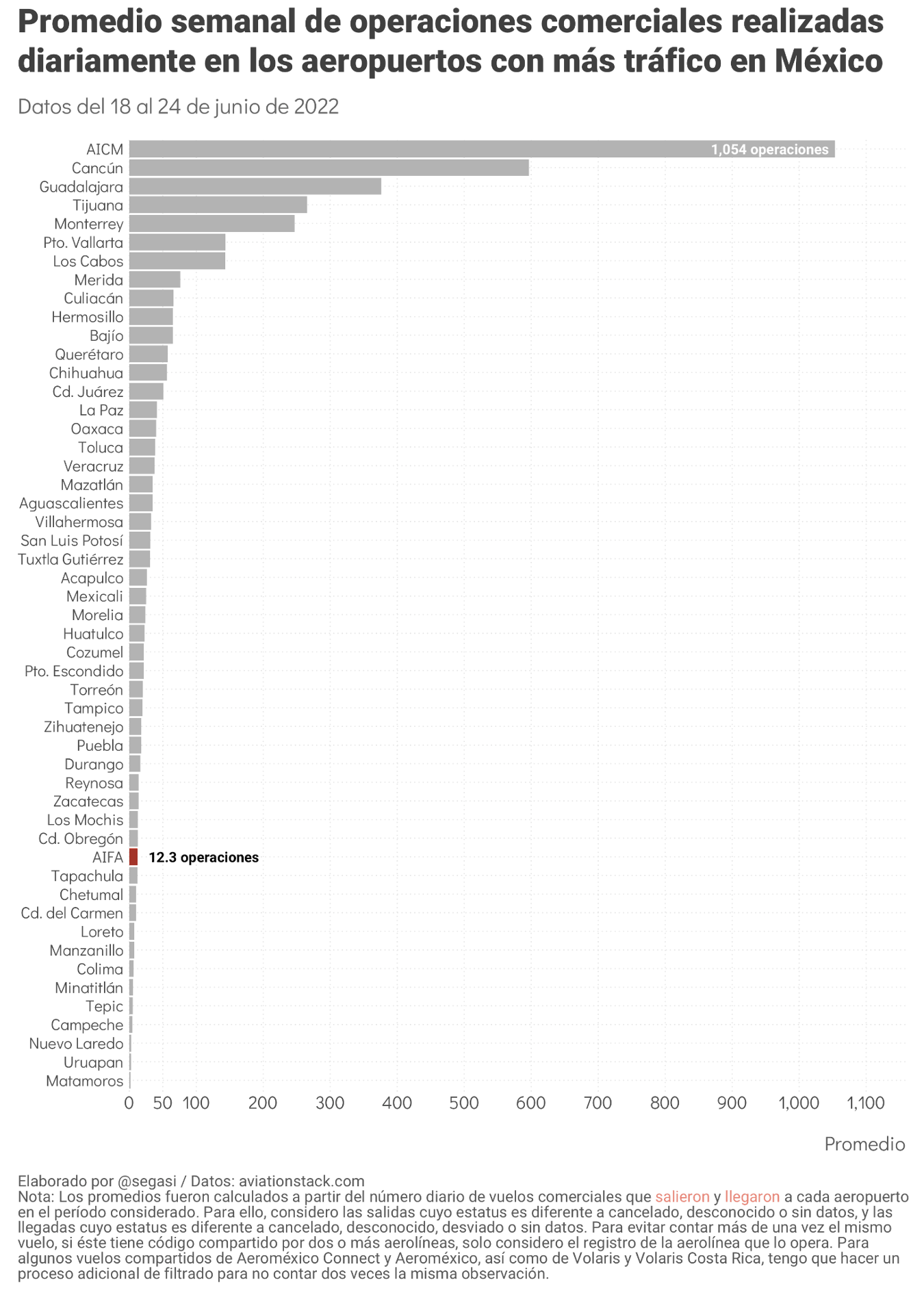 A lo largo de su semana 18 como terminal comercial (18 al 24 de julio), el AIFA registró, en promedio, 12.3 operaciones diarias.14 Esta cifra ubicó al nuevo aeropuerto en la posición 39 (barra guinda en la siguiente gráfica) de la lista de aeropuertos con mayor tráfico aéreo de nuestro país, abajo de Zacatecas (13.6), Los Mochis (12.9) y Cd. Obregón (12.6), y ligeramente por encima de Tapachula (12).