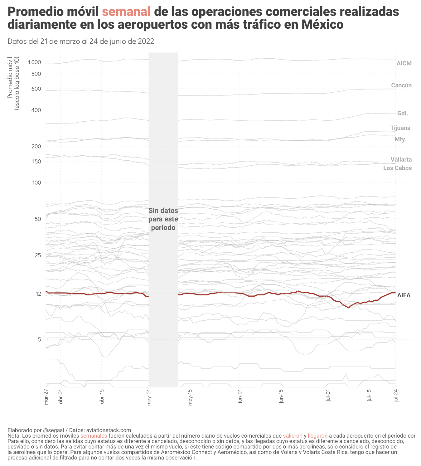Termino este texto anticipando un cambio importante que se verá reflejado en la próxima entrega. Por diversos motivos, a partir de la actualización de agosto dejaré de utilizar la información de la API de aviationstack.com y me concentraré en analizar las cifras oficiales publicadas cada mes por la Agencia Federal de Aviación Civil para todos los aeropuertos del país, y las no oficiales publicadas diariamente por FlightAware para datos del AIFA. Esto tendrá algunos costos en cuanto a la periodicidad y granularidad de la información, pero una ventaja sustantiva: me permitirá publicar el código y datos para hacer plenamente replicables estos análisis.