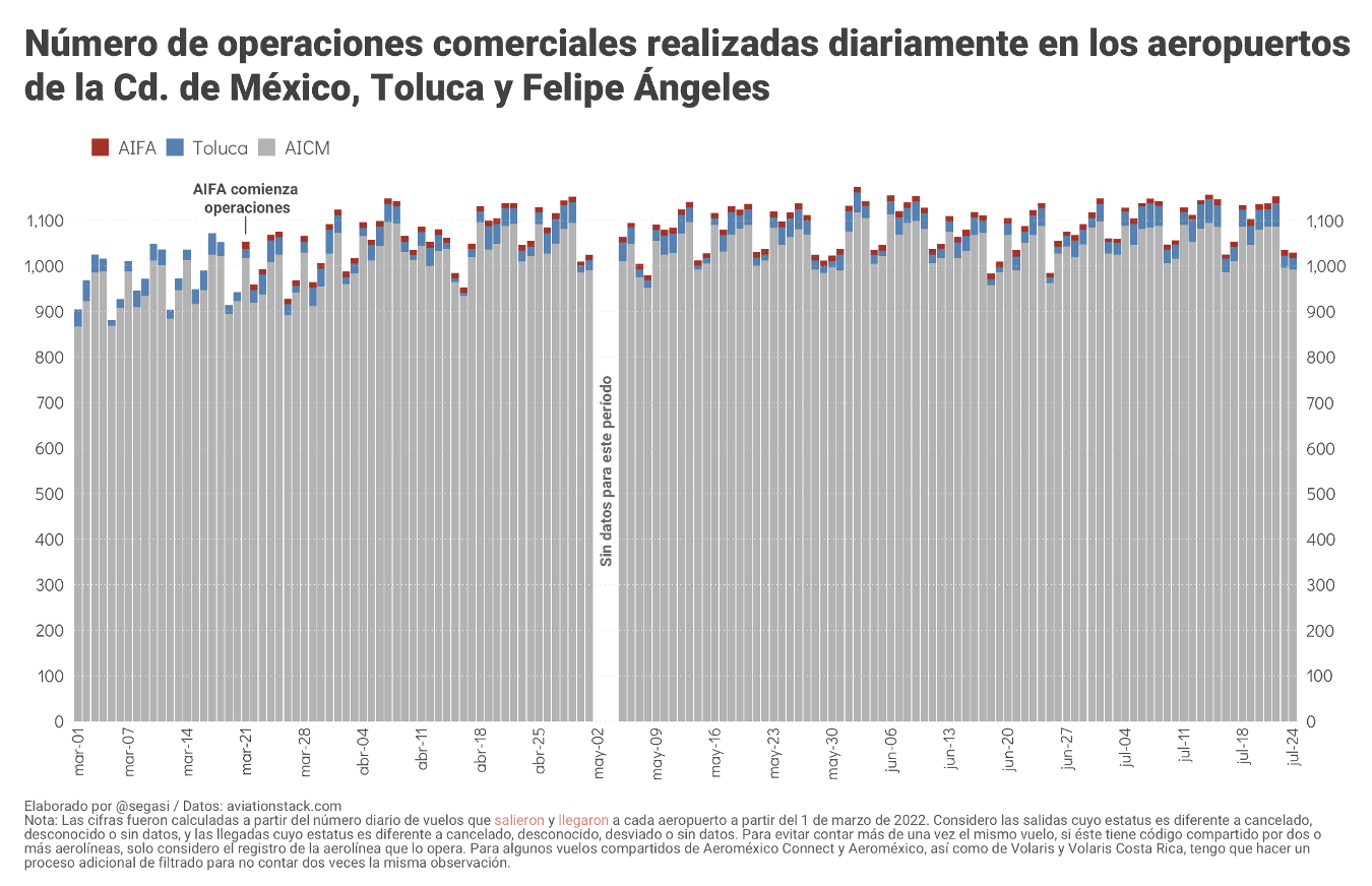 Cuatro meses después de que el AIFA fuera inaugurado, los resultados calculados a partir de la información provista por la API no muestra variación sustantiva alguna en la proporción de operaciones comerciales realizadas diariamente en cada aeropuerto. En 13 de los 24 días de julio el AIFA atendió a menos del 1 % de los vuelos comerciales realizados cada día en el SAM, y en los 11 restantes no superó el 1.3 %. Durante el mismo período, el porcentaje de vuelos que salieron y llegaron del aeropuerto de Toluca osciló entre 2.5 y 4.6 %. El resto de las operaciones diarias, entre 94.3 y 96.8 %, tuvieron lugar en el AICM.