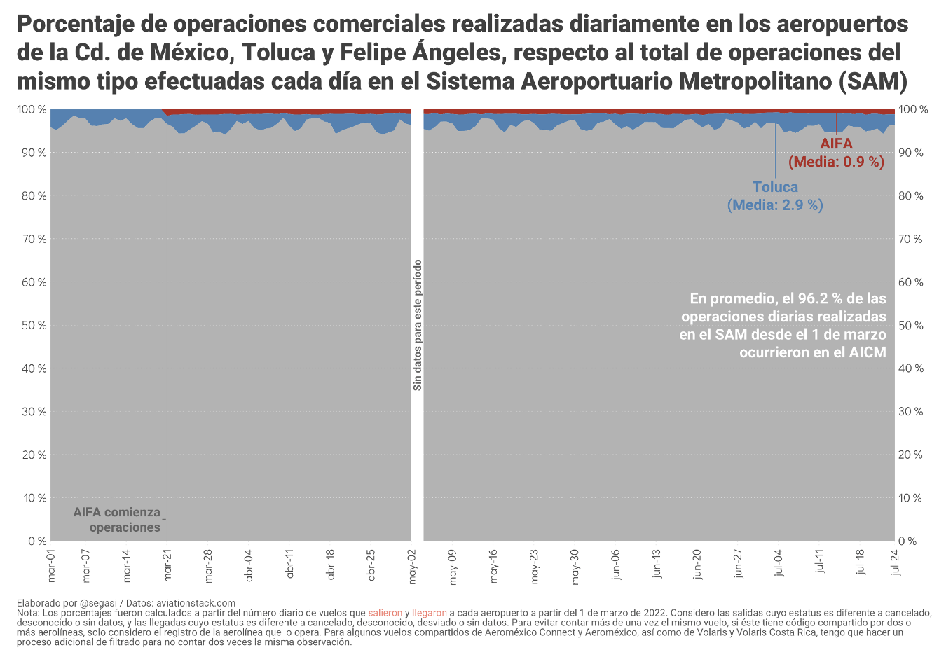 Los resultados calculados a partir de aviationstack.com también ilustran que, durante los 28 días transcurridos entre el 27 de junio y el 24 de julio, el volumen total de vuelos comerciales realizados diariamente en los tres aeropuertos que integran el SAM (AICM, AIFA y Toluca) se mantuvo en un rango parecido al reportado en el mes previo, así como que el mayor porcentaje de las operaciones de estos aeropuertos (más del 95 %) se sigue concentrando en el AICM.