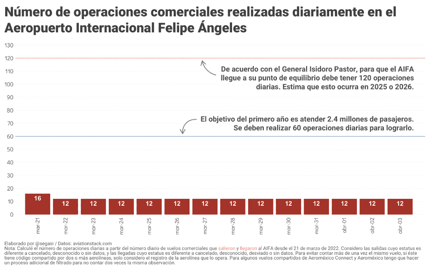 El general Isidoro Pastor Román (1, 2 y 3), director general del AIFA, ya había anticipado que éste sería el volumen de tráfico aéreo comercial durante las primeras semanas. Aun así, el promedio de operaciones diarias registrado en las dos primeras semanas del nuevo aeropuerto representa el 20 % del objetivo para el primer año (60 operaciones diarias) y 10 % de las 120 operaciones diarias que necesita para alcanzar su punto de equilibrio y comenzar a generar ganancias.4