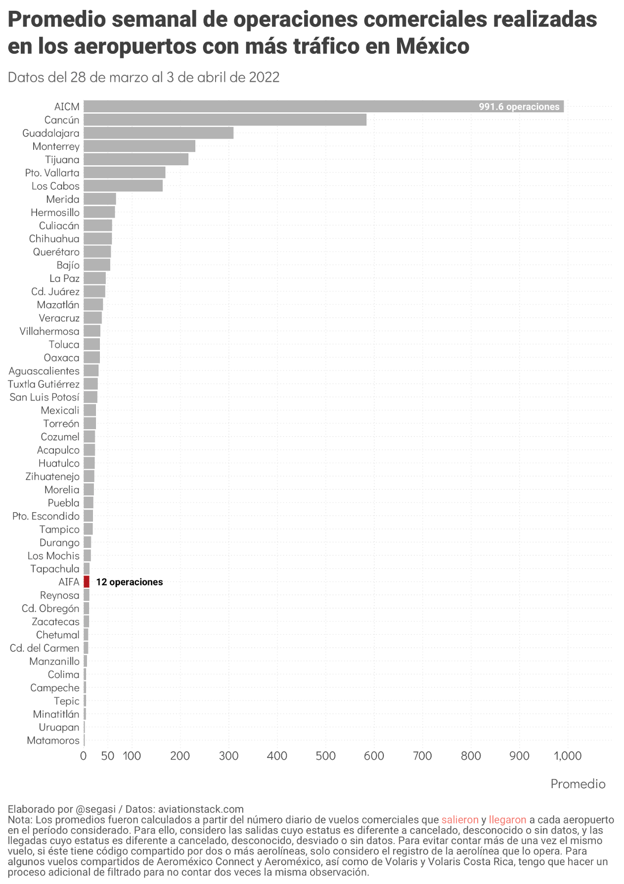 Los resultados indican que no hubo cambios significativos en la semana que va del 28 marzo al 3 de abril. En este período el AIFA registró 12 operaciones comerciales diarias, lo que lo ubica en la posición 37 en la lista de los aeropuertos con mayor tráfico aéreo de México (en la primera semana registró 12.6 operaciones diarias, en promedio, y se ubicó en la posición 36). De nueva cuenta, el volumen de vuelos comerciales del nuevo aeropuerto fue muy parecido a los de Ciudad Obregón, Reynosa y Tapachula.