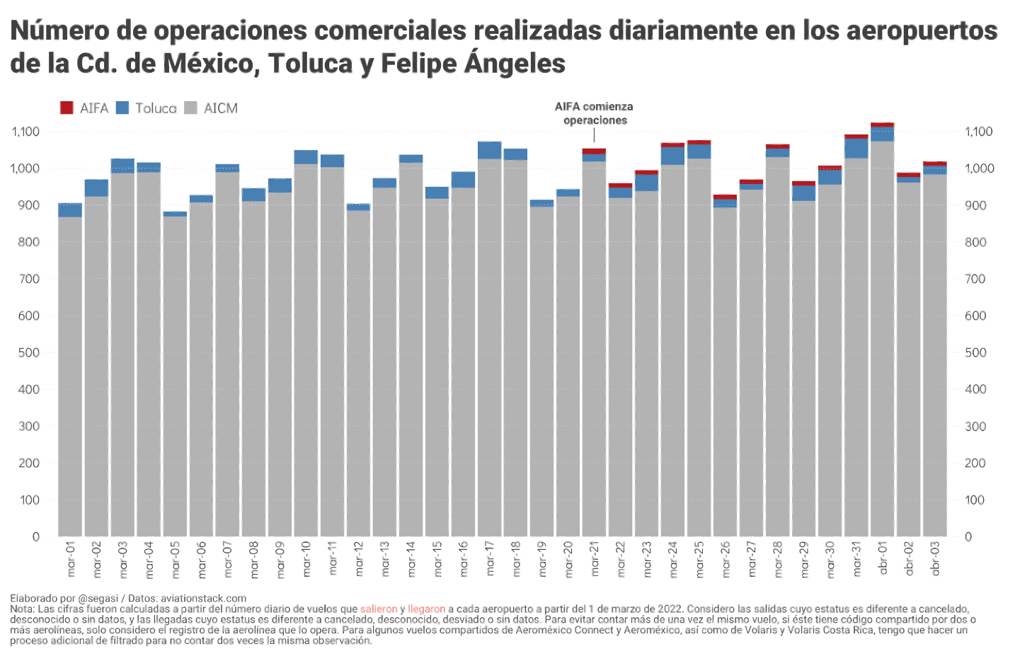 Dado el bajo número de operaciones realizadas en el AIFA durante su segunda semana como aeropuerto comercial, no hubo cambios sustantivos ni en el volumen total de vuelos llevados a cabo en los tres aeropuertos que integran el SAM (AIFA, Ciudad de México y Toluca), ni en la distribución de estas operaciones entre aeropuertos.