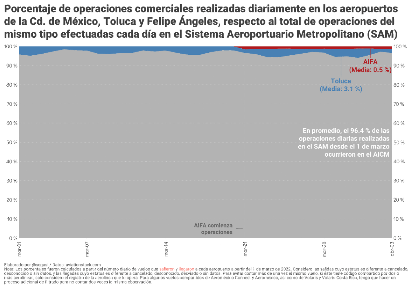 Dos semanas después de que el AIFA fuera inaugurado, los resultados indican que entre el 21 de marzo y 3 de abril el aeropuerto de la Ciudad de México concentró poco más del 96.4 % de las operaciones diarias del SAM, prácticamente el mismo porcentaje que en el corte anterior, y cifra muy parecida a la registrada entre el 1 y 20 de marzo.