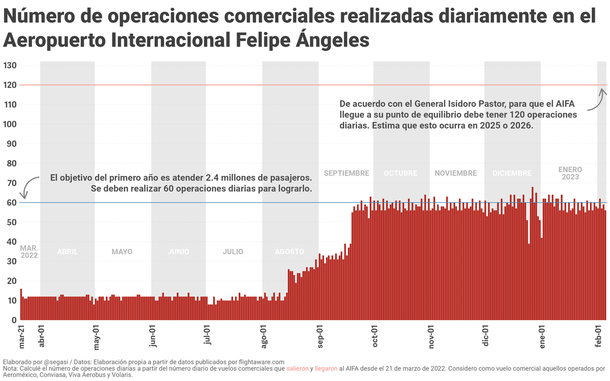 En diciembre de 2022 y el 5 de febrero de 2023 se mantuvo el patrón iniciado el 19 de septiembre del año previo. A lo largo de estos dos meses el promedio semanal de operaciones diarias del nuevo aeropuerto osciló entre 56.9 y 61.4, muy cerca de la meta de 60 operaciones diarias fijada por el director del AIFA, el general Isidoro Pastor Román, para su primer año de operaciones.