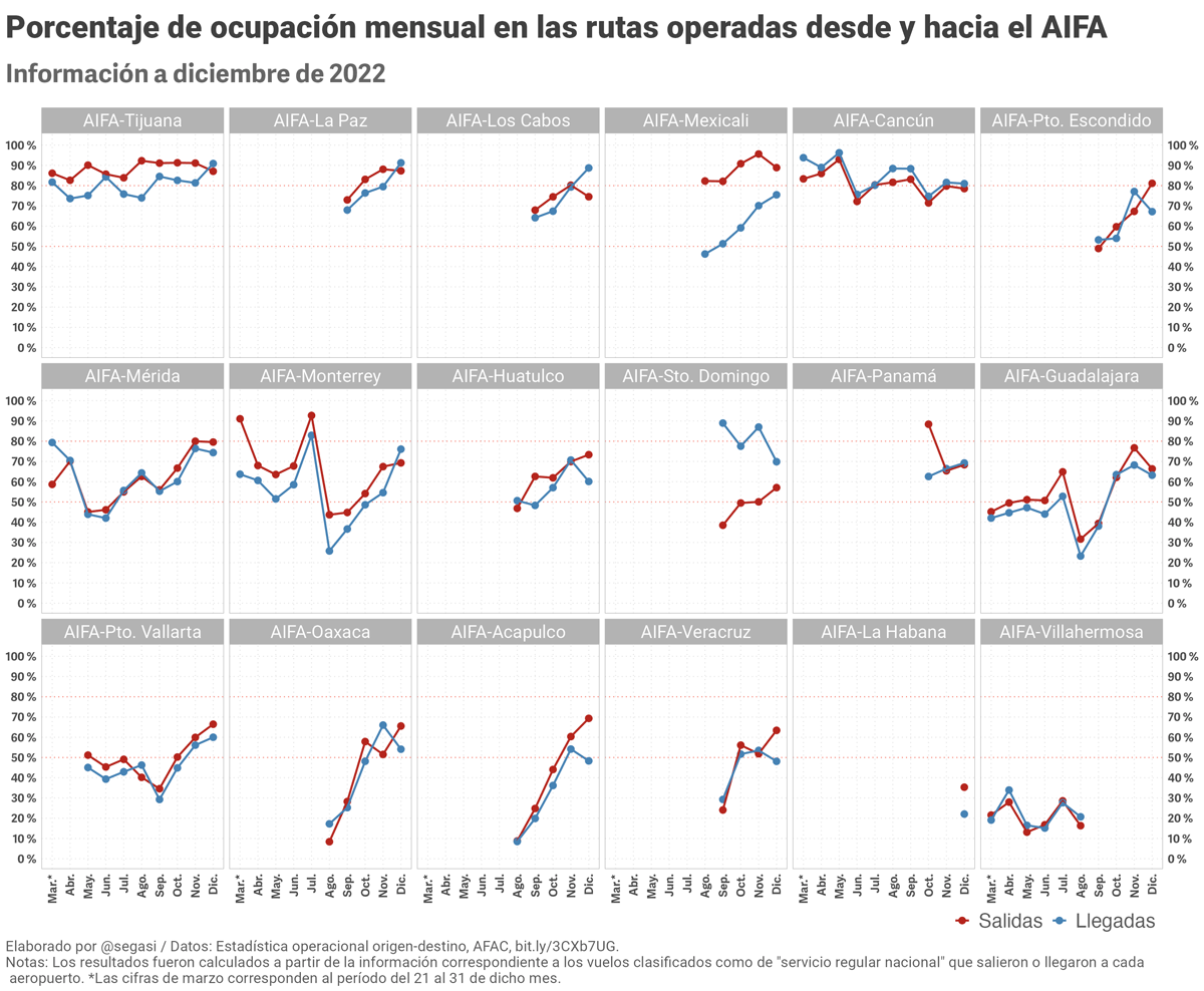 La siguiente gráfica ofrece una perspectiva más detallada sobre la ocupación promedio de los vuelos desde y hacia el nuevo aeropuerto. Cada panel corresponde a una ruta aérea entre el AIFA y una de las 18 ciudades a las que volaron las compañías aéreas nacionales hasta diciembre. El color de las líneas y puntos indica si son vuelos que salieron del nuevo aeropuerto (rojo) o llegaron al mismo (azul). La altura de los puntos es proporcional al porcentaje de ocupación promedio que tuvieron los vuelos de cada ruta y dirección entre marzo (los últimos 11 días) y diciembre.8
