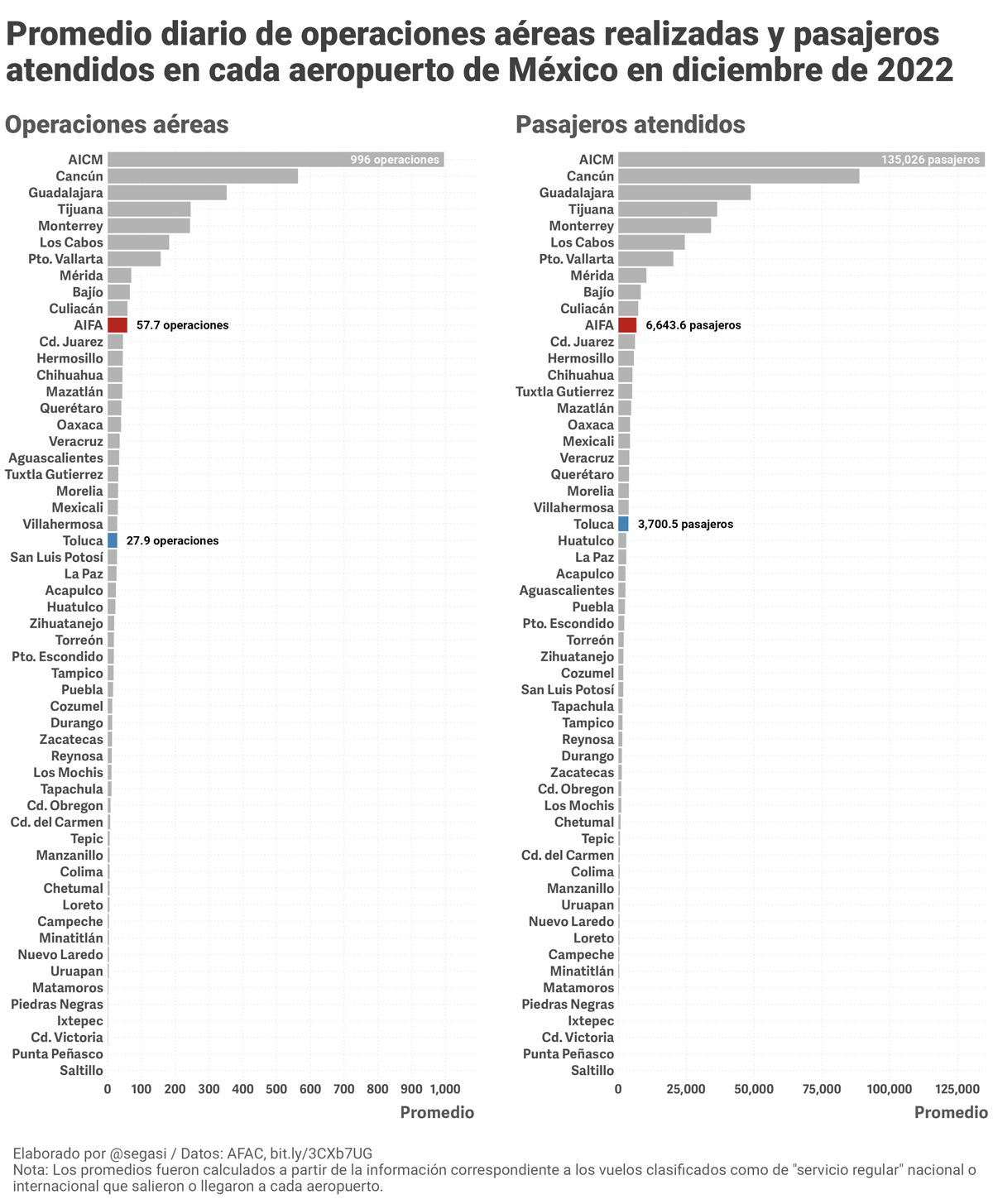 La gráfica muestra que, al igual que lo ocurrido desde octubre, en el último mes del 2022 el AIFA ocupó la posición 10 en cuanto al promedio diario de operaciones, con 57.7, y la 11 respecto al promedio diario de pasajeros atendidos, con 6643.6. Estas cifras representan aproximadamente el 1.5 % del total de pasajeros atendidos y operaciones realizadas diariamente en diciembre en los 56 aeropuertos incluidos en la base de datos de la AFAC.