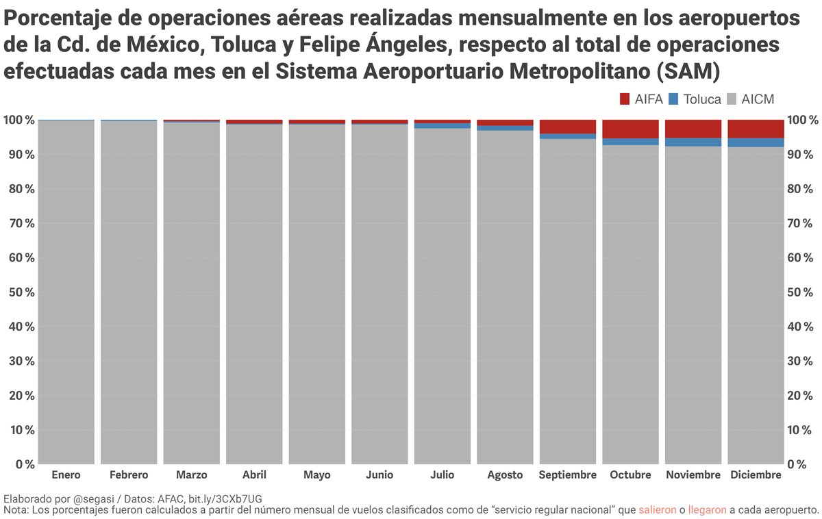 La región gris en cada barra es proporcional al número de operaciones realizadas cada mes en AICM, la azul a las de Toluca y la roja a las del AIFA. La altura de cada barra corresponde al total de operaciones mensuales registradas en el Sistema en su conjunto.