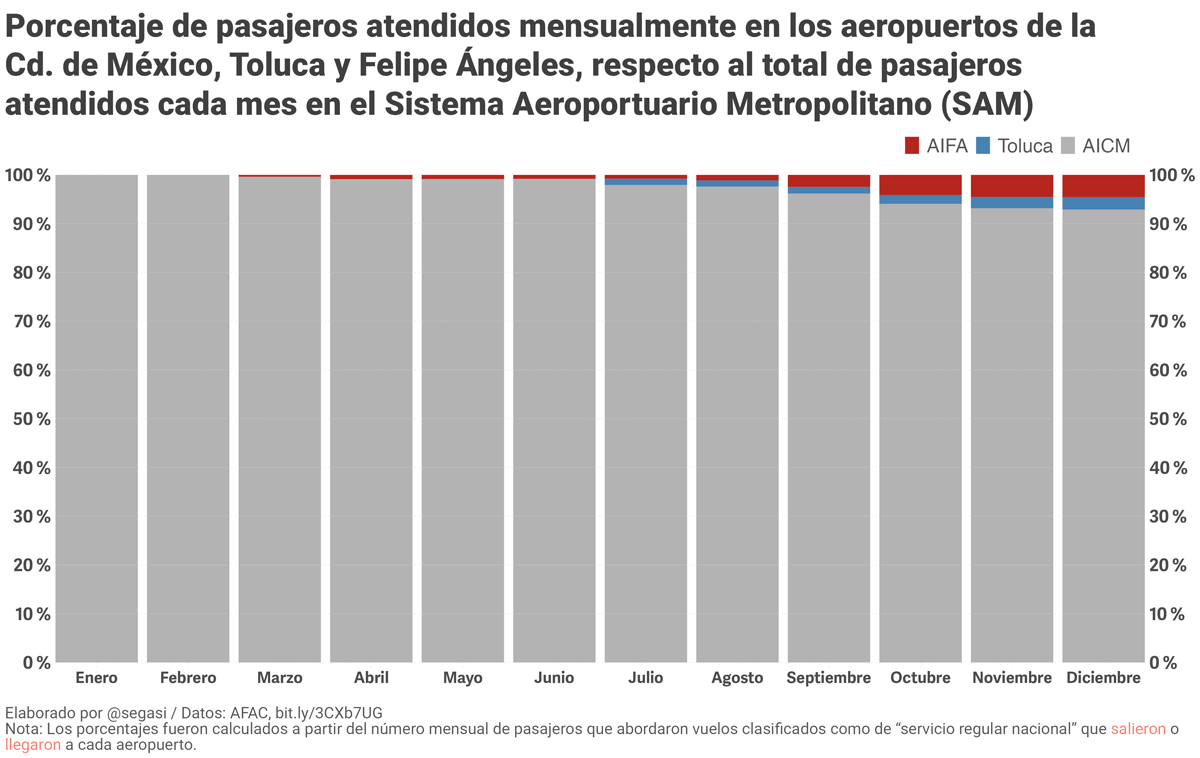 Los resultados calculados a partir de la información oficial también ilustran que en diciembre el volumen total de vuelos realizados diariamente en los tres aeropuertos (AICM, AIFA y Toluca) que integran el Sistema Aeroportuario Metropolitano (SAM) llegó a su segundo nivel más alto desde marzo, con 33 673 operaciones. En este mismo mes el SAM atendió a poco más de 4.5 millones, la cifra mensual más alta de 2022. Al analizar la participación de cada aeropuerto, las cifras oficiales muestran que el aeropuerto de la Ciudad de México sigue predominando, pues atiende a más del 92 % de las operaciones aéreas y de los pasajeros del mismo.