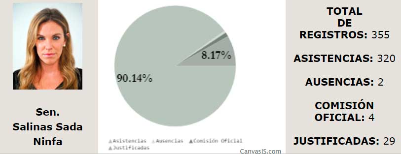 Como decíamos, hubo 627 votaciones totales en esta Legislatura en el Senado, con un promedio de asistencia del 70%. Aunque existe mucha diferencia entre la asistencia a sesión plenaria y la participación en votaciones. Ese el caso de la senadora Ninfa Salinas del PVEM, hija de Ricardo Salinas Pliego, pues tiene una asistencia del 90 por ciento pero una participación en votaciones de apenas el 30 por ciento.