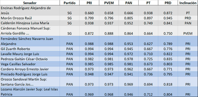 Un total de 13 senadores obtuvieron una similitud más alta con un partido al que no pertenecen (se excluye aquí a seis senadores del PRD que pasaron al PT después de la creación del Frente por México):