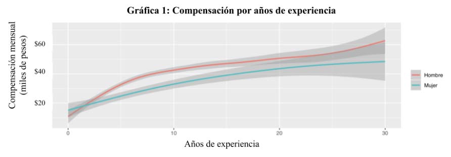 Además de la preparación académica, la experiencia puede ser un factor que explica una diferencia en salarios. ¿Los hombres y mujeres con mismo número de años de experiencia ganan lo mismo?