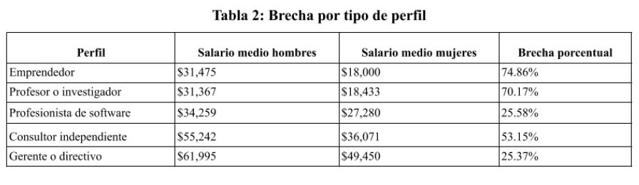 Analizamos también si el tipo de puesto o rol es un posible factor. La brecha se mantiene en todos los casos, aunque varía en términos de magnitud, donde las de mayor brecha porcentual son emprendedor y profesor/investigador.