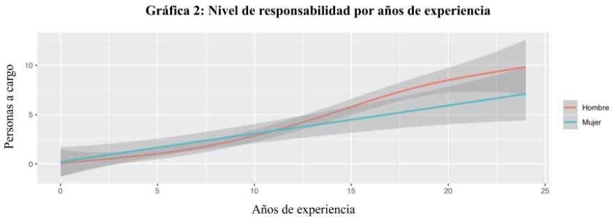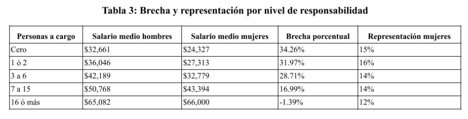 La proporción de mujeres disminuye para niveles de responsabilidad más altos (donde la brecha es menor) aunque no radicalmente. Esto es suficiente para sugerir que puede existir discriminación no solamente en cada nivel salarial y de responsabilidad sino que las mujeres enfrentan obstáculos adicionales para acceder a niveles de mayor compensación y responsabilidad.