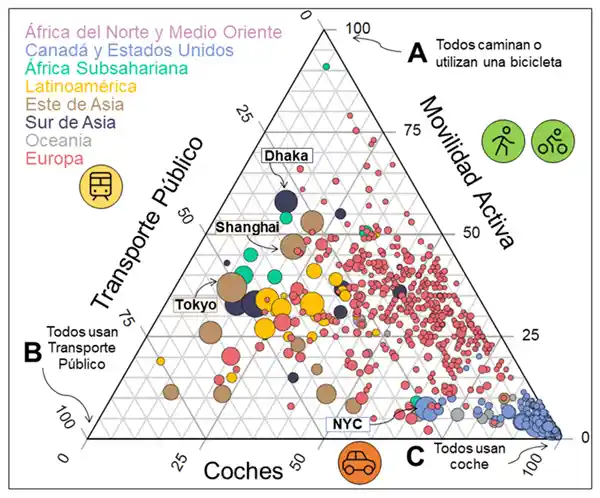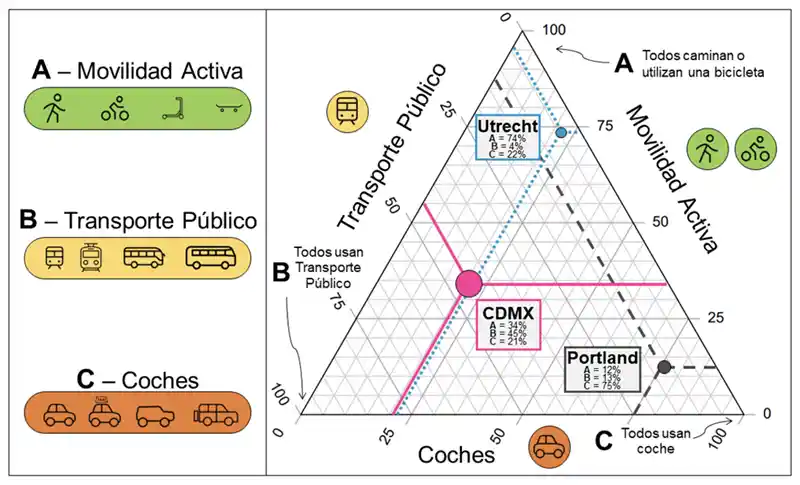 La movilidad en la Zona Metropolitana del Valle de México es 34 % en A, 45 % en B y solo 21 % en C. De esta manera podemos imaginar la movilidad de una ciudad e incluso comparar entre distintas regiones del mundo. Por ejemplo, encontramos que casi el 92 % de los viajes dentro de una ciudad en Estados Unidos son del tipo C. Incluso en zonas metropolitanas con un enorme sistema de transporte público, como Nueva York, 68 % de sus viajes son en coche.