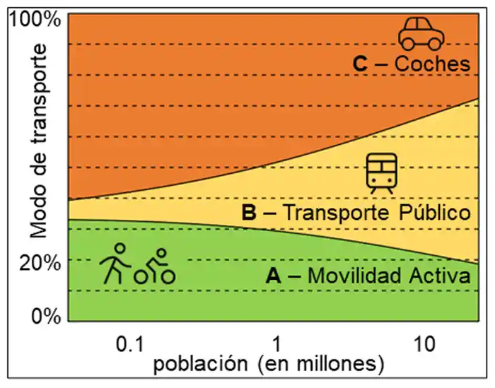 La movilidad en una ciudad está correlacionada con su tamaño. Por lo general, en ciudades pequeñas, la distancia que tiene que recorrer una persona entre su casa y su trabajo es corta, así que los viajes del tipo A (caminando o en bici) son relativamente frecuentes. Sin embargo, en ciudades pequeñas es muy difícil que, quizás debido a sus costos de implementación para poca demanda, exista un buen Transporte Público, así que los viajes del tipo B son muy escasos. Por ello, y a falta de opciones, en ciudades pequeñas, los viajes del tipo C (en coche) suelen ser muy frecuentes. Pero lo opuesto sucede en ciudades grandes. En zonas metropolitanas con millones de habitantes la distancia de un viaje puede ser de varios kilómetros. Por ello, es relativamente difícil caminar o andar en bicicleta, así que los viajes del tipo A son menos frecuentes. Sin embargo, en ciudades grandes, el Transporte Público suele ser una mejor opción para esos viajes largos. Lo que encontramos (fuera de Estados Unidos) es que en ciudades más pobladas, los viajes del tipo A y los viajes del tipo C son menos frecuentes, y el Transporte Público es la mejor opción para moverse.