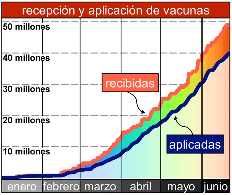 En enero sólo se recibían vacunas Pfizer y las entregas fueron suspendidas por tres semanas. Desde el embarque con 219 375 dosis recibido el 19 de enero no se recibió otro embarque de esta farmacéutica hasta el 16 de febrero. En vez de aplicar las vacunas recibidas rápidamente, las autoridades de salud prefirieron dosificarlas —¿para tener algo que informar en cada conferencia diaria?—. El resultado fue que el 14 de febrero aplicaron sólo 154 de las 32 608 dosis que tenían en reserva. Las dosis aplicadas ese día fueron recibidas 26 días antes, en el embarque del 19 de enero. Para comparar, estamos aplicando un promedio de 390 000 vacunas cada día. Sin embargo, ahora, con un proceso de vacunación más estable, entre marzo y el 19 de junio hay una brecha entre lo que recibimos y lo que aplicamos que va en un claro aumento. De hecho, hemos recibido casi 23 % más vacunas de las que hemos aplicado.