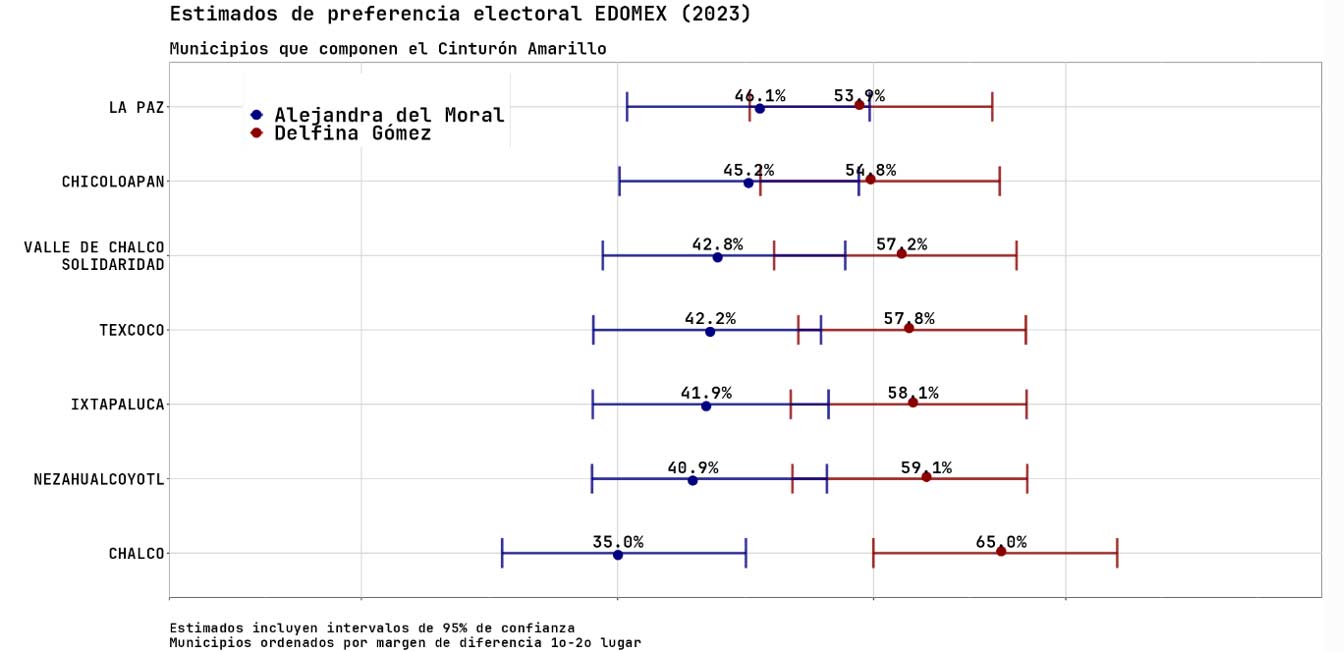 Por su parte, la preferencia estimada para Alejandra del Moral luce dispersa en todo el estado y tiene los porcentajes más altos en Luvianos (65.4 %), Chimalhuacán (54.3 %), Villa Victoria (52.1 %) y Huixquilucan (48.9 %), aunque de estos municipios únicamente Chimalhuacán es gobernado por Morena. Incluso en los municipios del también llamado “cinturón amarillo”, la preferencia por Del Moral sólo es alta en La Paz y Chicoloapan (46.1 % y 45.2 %, respectivamente). En la gráfica 2 mostramos las estimaciones para los municipios del “cinturón amarillo” ordenadas también de menor a mayor diferencia entre estimaciones. A diferencia del “corredor azul”, la ventaja de Delfina Gómez sobre Alejandra del Moral es un poco menos cerrada. Únicamente en Chalco la candidata de Morena parece tener una ventaja holgada, mientras que en La Paz y Chicoloapan la diferencia es menor a los 10 puntos.