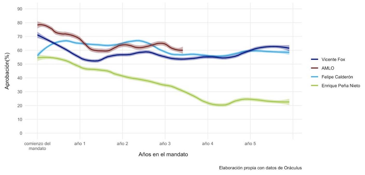 La gráfica 1 —basada en los datos recolectados por el sitio agregador de encuestas, Oraculus— muestra el ciclo de la aprobación presidencial de los últimos cuatro presidentes en México. En dicha gráfica destacan dos puntos importantes. Uno, los presidentes mexicanos, en promedio, no suelen seguir el patrón bastante consistente de la aprobación presidencial registrado en Estados Unidos y Latinoamérica. A excepción de Peña Nieto, los presidentes mexicanos —Fox, Calderón y AMLO— registran una popularidad bastante consistente a lo largo de su administración: alrededor del 60 % de aprobación presidencial. En el caso de Fox y López Obrador, su luna de miel es más marcada, seguida de un declive, pero éste no es tan dramático como la de otros presidentes en Estados Unidos o América Latina.