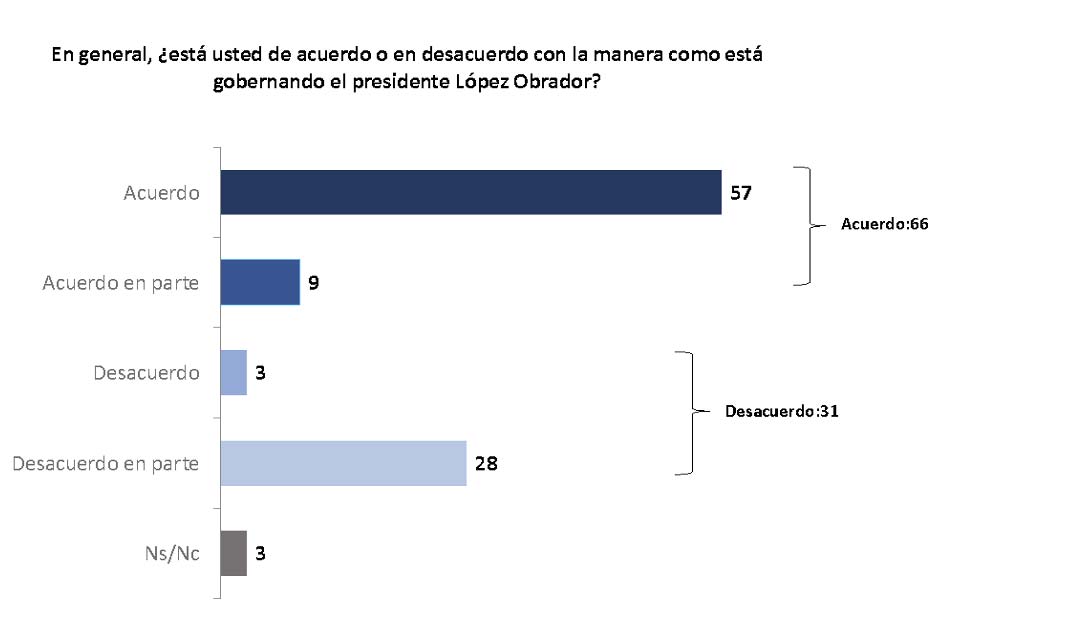 12 Otros fraseos, por ejemplo, el del Estudio Nacional Electoral de México (ENEM): “En general, ¿usted está de acuerdo o en desacuerdo con la forma como está gobernando el presidente López Obrador?” (Acuerdo/acuerdo en parte/desacuerdo en parte/desacuerdo).