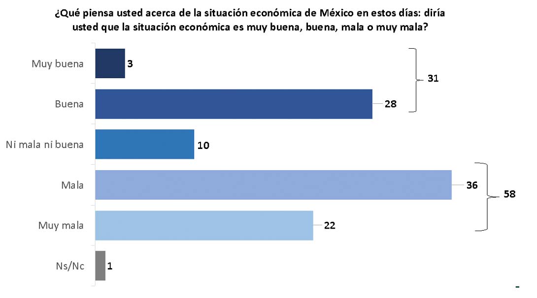 Tal aparente contradicción es importante dado que la literatura académica ubica las evaluaciones retrospectivas económicas como el principal predictor de la aprobación presidencial:8 quienes consideran que la economía va bien, tienen una alta probabilidad de aprobar el trabajo del presidente en turno. Y en contraparte, quienes consideran que la economía va mal, desaprueban al gobierno en turno. Para ilustrar este punto, en la gráfica 2 se reporta los resultados sobre la percepción económica del país. Los datos provienen del Estudio Nacional Electoral de México 2021 (ENEM), encuesta postelectoral representativa a nivel nacional que es parte del Estudio Comparado sobre Sistemas Electorales9 (CSES, Comparative Study of Electoral Systems). En esta encuesta, la mayoría del electorado es crítico de la situación económica del país (58 % considera que está mal o muy mal) pero, al mismo tiempo, reportan una alta aprobación presidencial (66 % acuerdo/acuerdo en parte).