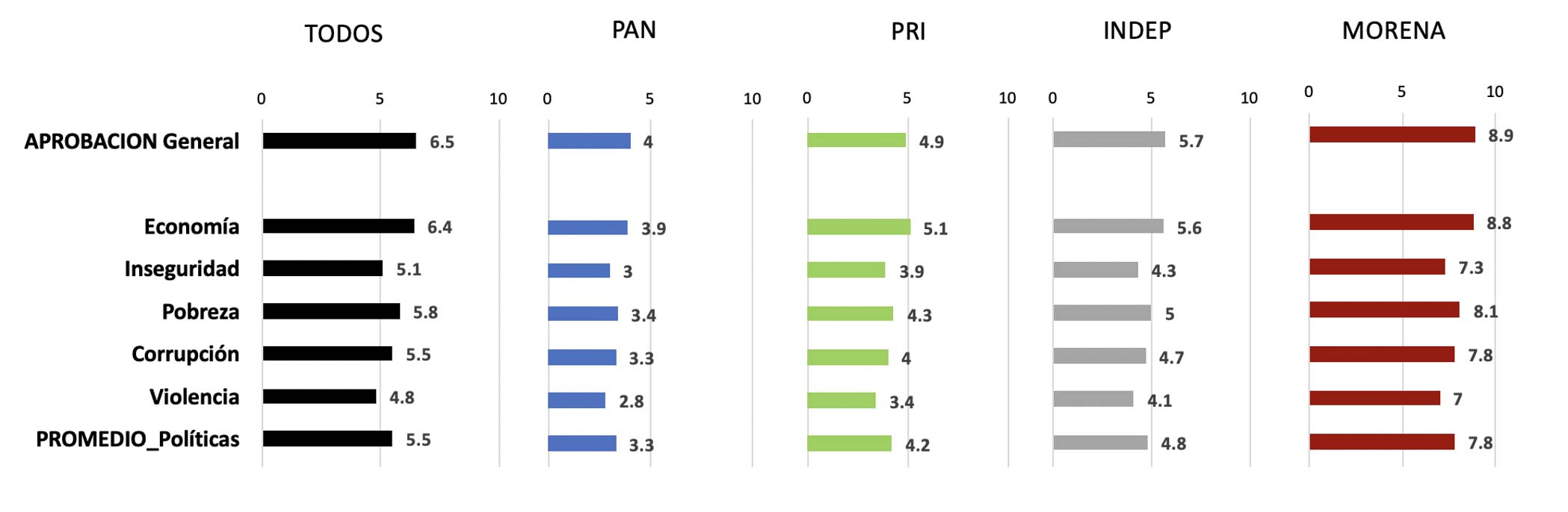 Ahora bien, cuando observamos las columnas 2 a 5 de la Gráfica 4, vemos que esa diferencia entre la aprobación presidencial y la aprobación del trabajo del presidente López Obrador en distintos rubros de política pública es menor entre votantes de oposición (PAN: 0.7: PRI 0.7) que entre votantes de Morena (1.1). Es decir, entre morenistas existe una mayor distancia entre su aprobación presidencial general y la aprobación que los morenistas realizan del trabajo del presidente López Obrador. En la última sección de este trabajo, explico qué factores explican esta brecha.