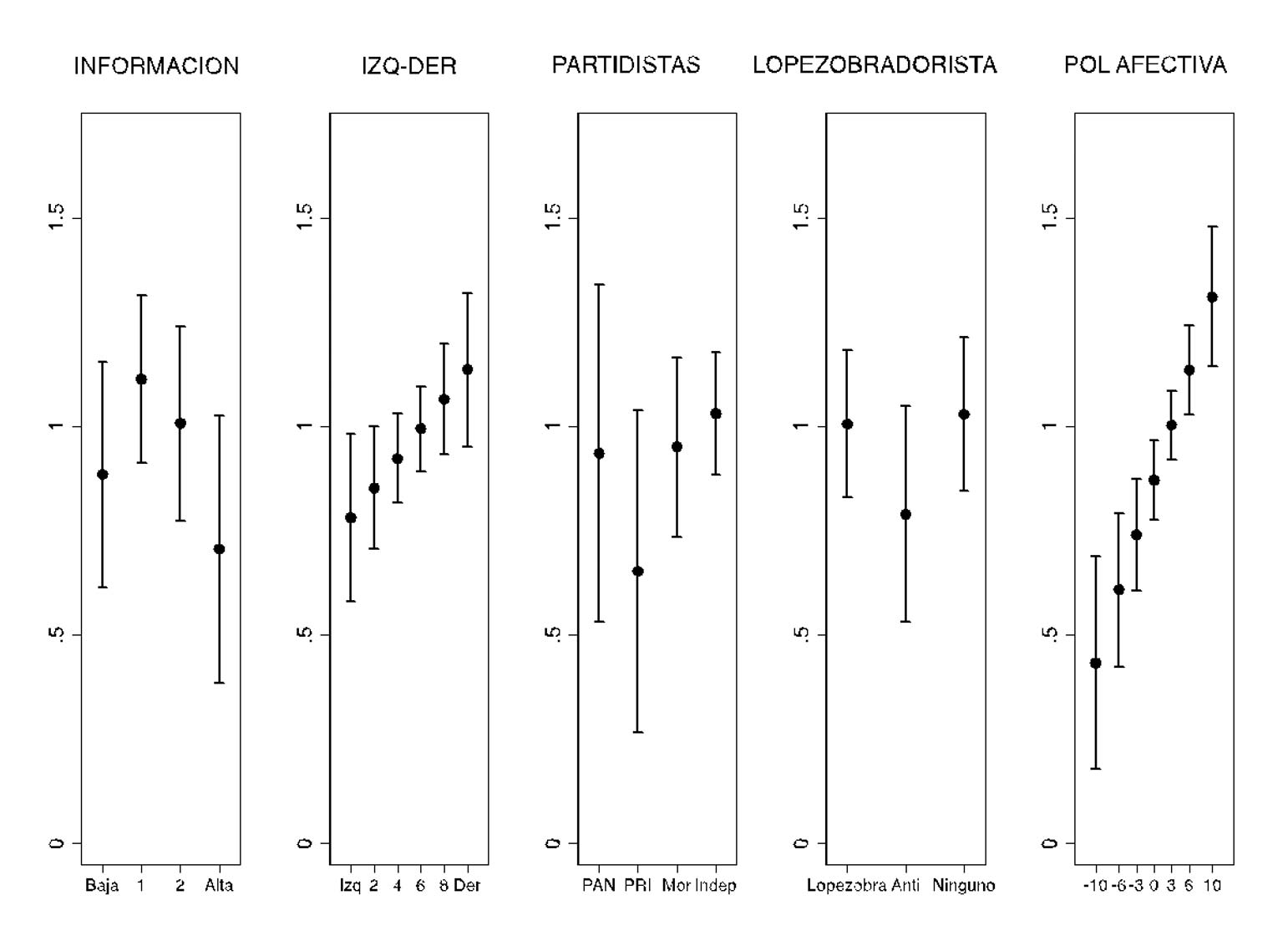 Alternativamente, puede ser que no sea la identidad partidista sino la ideología izquierda-derecha lo que explique esa diferencia entre aprobación presidencial y aprobación del trabajo del presidente López Obrador en distintos rubros de política pública. Igualmente, la información de los votantes podría incidir en esa diferencia. Dados altos niveles de información de los votantes, esto puede incidir en una sofisticación mayor en tanto que los votantes podrían discernir mejor entre una aprobación basada en políticas públicas y otro más en el trabajo general del presidente.