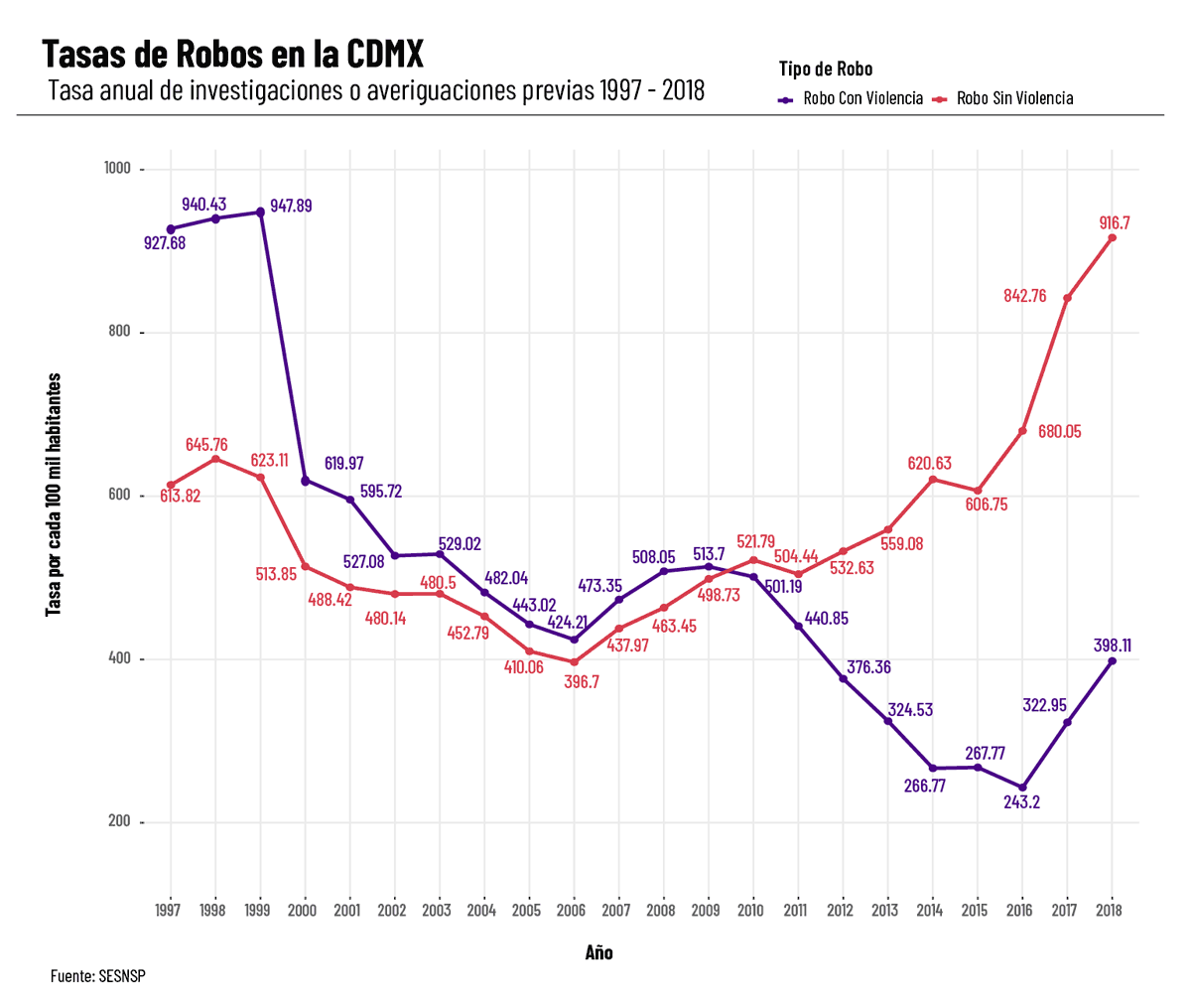 El SNSP subdivide a los robos de acuerdo a la presencia o ausencia de violencia para perpetrarlo. En ambas clasificaciones, la Ciudad de México ha reportado tasas particularmente altas desde 1997. Además, durante los últimos 21 años la tasa de investigaciones por robos, tanto violentos como no violentos, jamás ha sido inferior a 200 investigaciones por cada 100 mil habitantes.