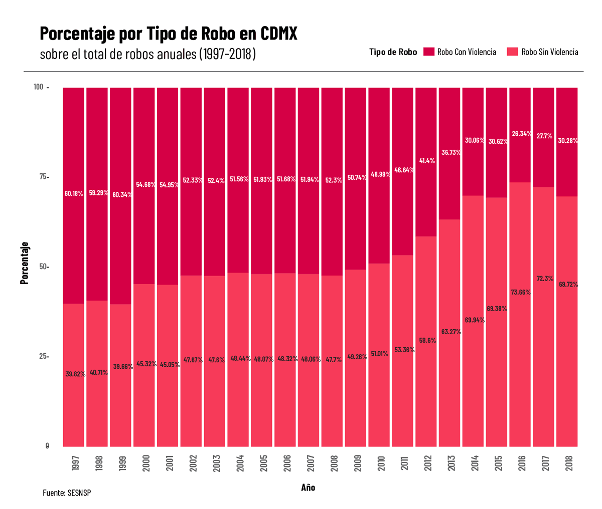 Dado lo anterior, no es sorprendente que los robos sin violencia representen un porcentaje mayor respecto a los robos con violencia en el total de robos investigados en la CDMX. Desde 2010, los robos sin violencia equivalen a más de la mitad de todos los robos cometidos, y desde 2014, equivalen a 2/3 partes o más de los mismos. Por su parte, se espera que para 2018 los robos sin violencia representen aproximadamente el 70% de todos los robos investigados.