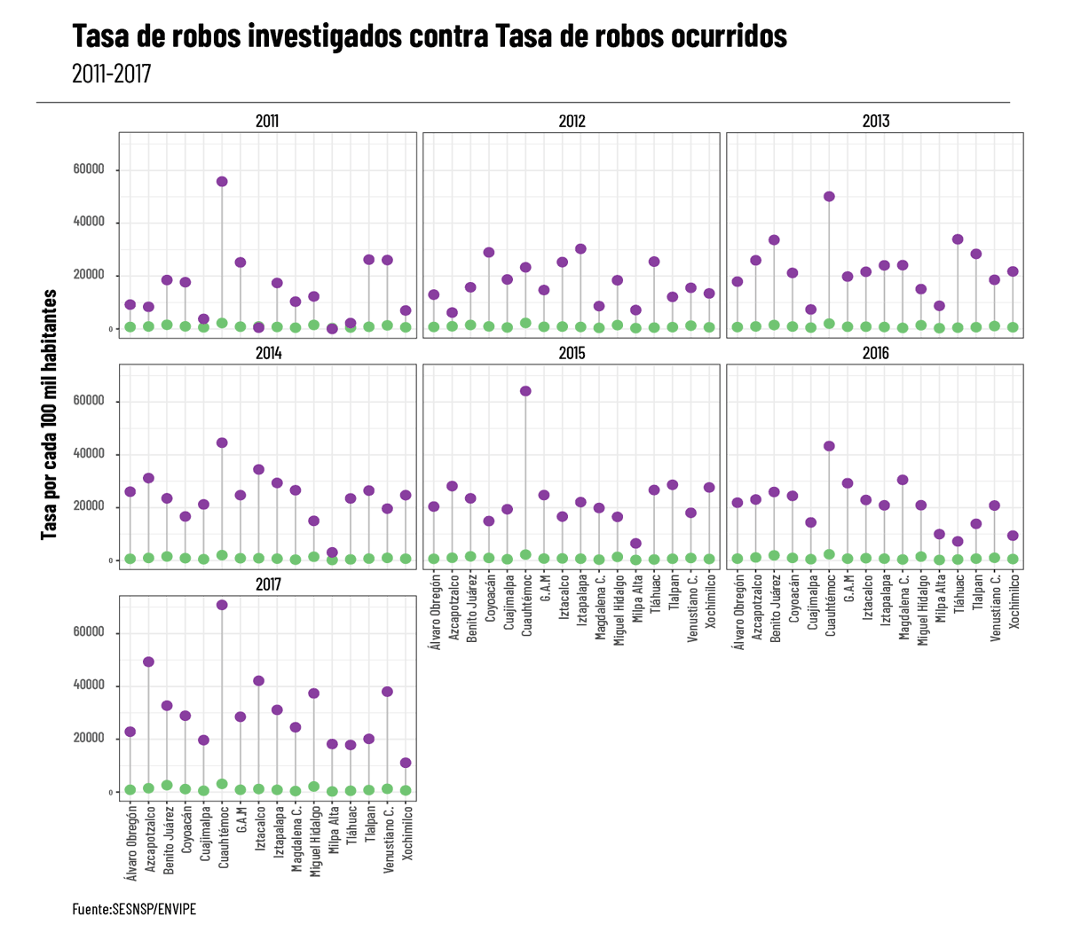 Los datos de victimización también a nivel de alcaldías nos dicen que, en promedio, en cada alcaldía ocurren 127 mil robos más de los que las autoridades dicen investigar. Entre ellas, el caso más grave es el de la alcaldía de Cuauhtémoc, en donde la tasa promedio de robos estimada por el ENVIPE entre 2010 y 2017 es de 50301 robos por cada 100 mil habitantes.