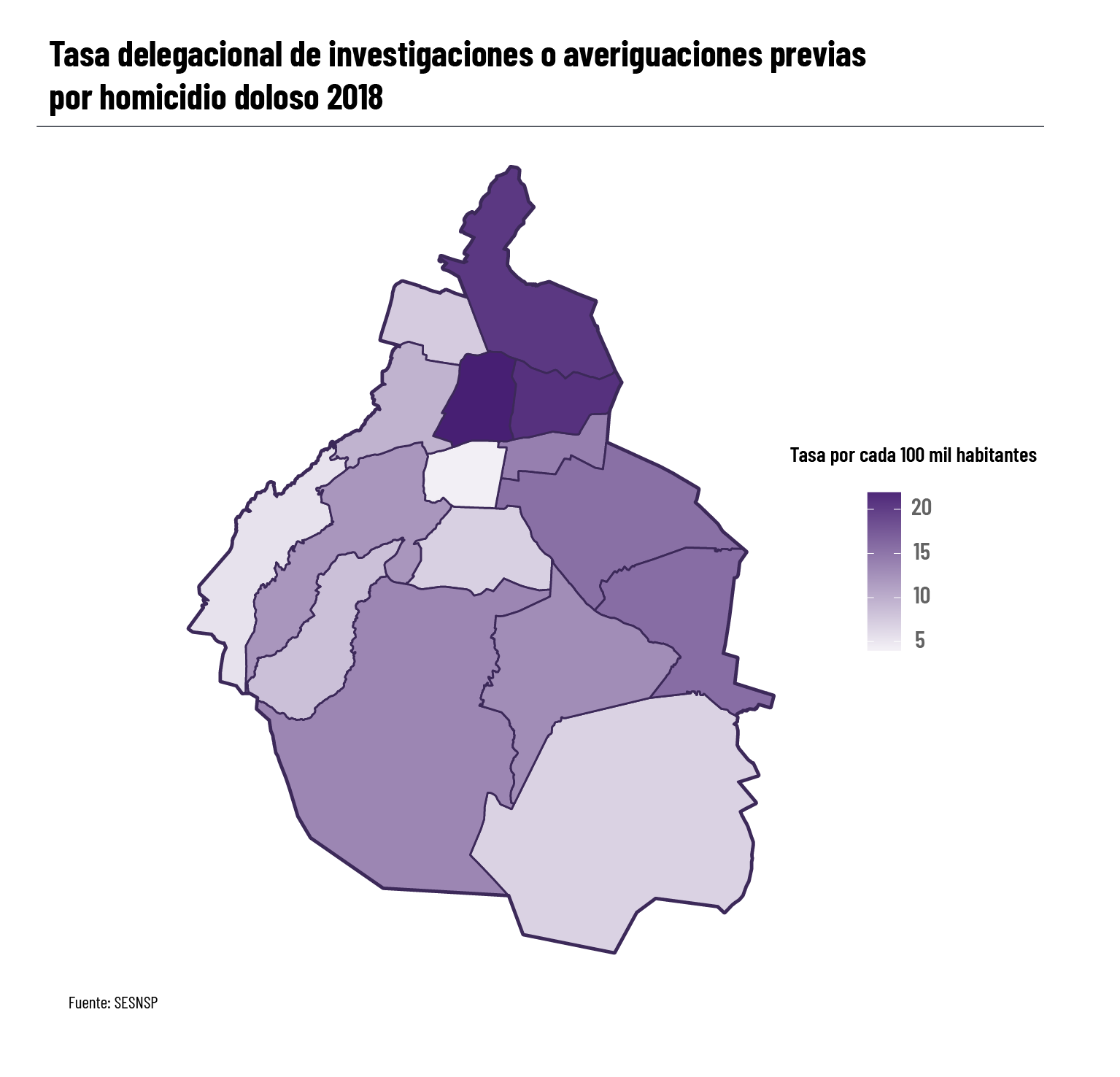 Lo anterior es el caso para los homicidios dolosos, los cuales en 2018 fueron más frecuentes en tres alcaldías: Gustavo Madero, Venustiano Carranza y Cuauhtémoc. En las primeras dos de estas alcaldías, el SNSP reporta una tasa de 20.26 y 20.93 investigaciones por homicidio por cada 100 mil habitantes, lo cual es significativamente mayor a la tasa promedio entre las alcaldías, que es igual a 12.23 investigaciones por cada 100 mil habitantes. Por su parte, la alcaldía de Cuauhtémoc reporta una tasa anualizada de 22.45 investigaciones por homicidio por cada 100 mil habitantes, lo que la hace la alcaldía con la tasa más alta en este 2018.
