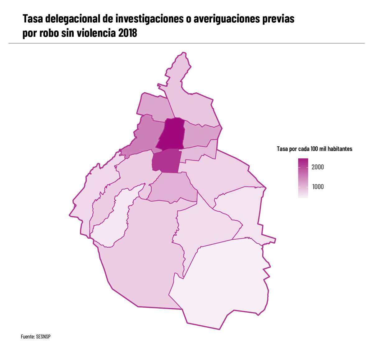 Por último, un patrón similar se presenta en el caso de los robos sin violencia; los cuales, como ya hemos visto, han aumentado de forma exacerbada durante los últimos años. Para el 2018, las alcaldías más afectas por este tipo de delito son las de Miguel Hidalgo, Benito Juárez y Cuauhtémoc. Para ser exactos, en la Miguel Hidalgo se reporta una tasa anualizada de 1558 investigaciones por robo sin violencia por cada 100 mil personas, mientras que en la Benito Juárez se espera una de aproximadamente 2723 investigaciones por cada 100 mil personas. Una vez más, Cuauhtémoc muestra la tasa más alta, en este caso por medio de una de 846 investigaciones por robo sin violencia por cada 100 mil personas.