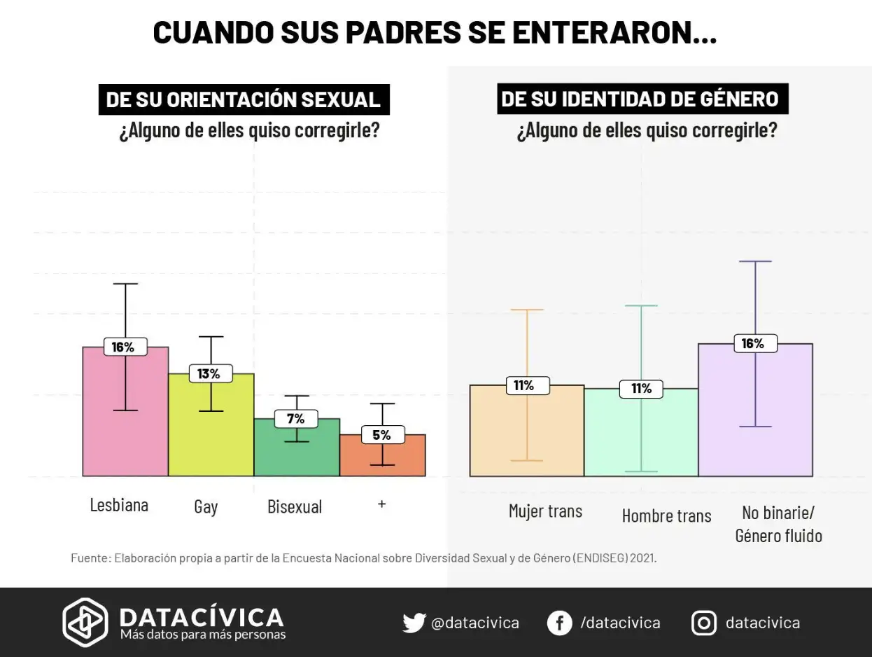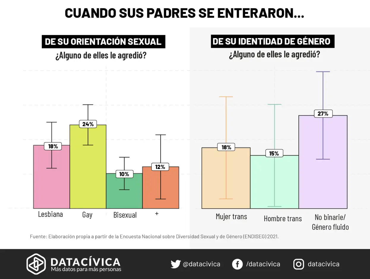 A partir de la Endiseg, analizamos cuántas personas y de qué grupo habían sufrido reacciones adversas al comunicar su identidad de género o su orientación con sus padres. Encontramos que el 16 % de las personas de orientación sexual no normativa fueron agredidas al hacerlo, y parece que fueron las personas que se autodenominan gay quienes sufrieron más agresiones. Mientras el 22 % de las personas de la diversidad de género que le dijeron a sus padres sobre su identidad no cis fueron agredidas al hacerlo, y parece que fueron las personas no binarias o de género fluido quienes más lo sufrieron.